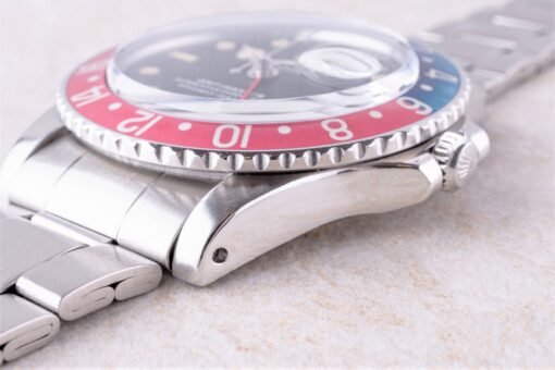 Die Lünette ist wunderbar scharf, zeigt nur geringe Tragespuren und die originale Pepsi Lünetteneinlage (mit rotem Rücken / redback) ist wunderbar gealtert.