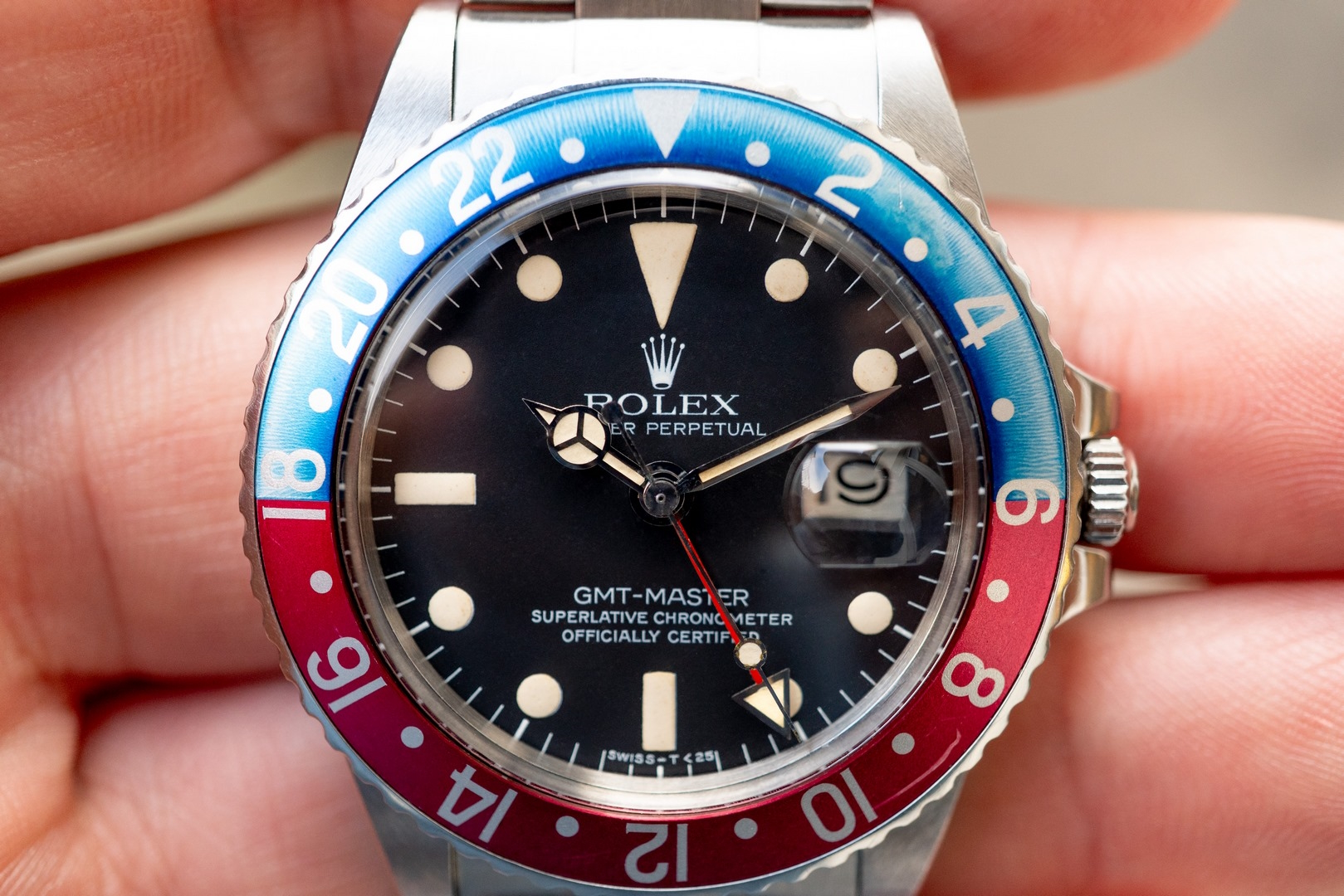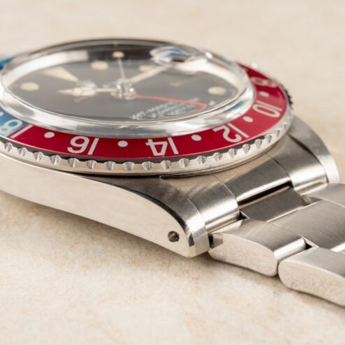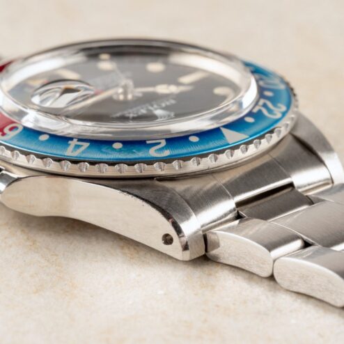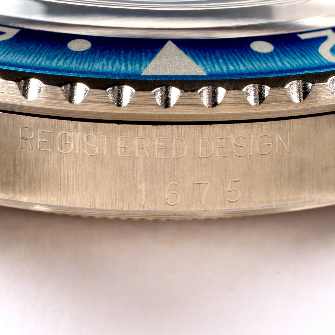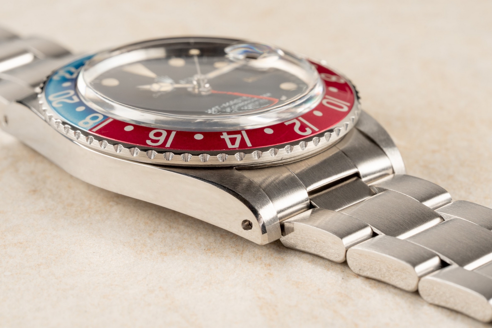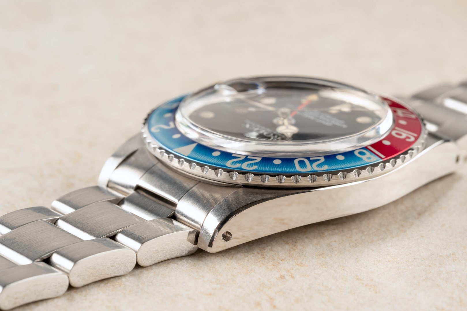 Die Lünette ist noch wunderbar scharf und wie die Bilder zeigen, kommt die Uhr mit einem herrlichen Pepsi Inlay mit roter Rückseite, sogenanntes redback. Die Alterung des Inlays ist wirklich extrem schön und passt perfekt zur Patina des Zifferblattes.