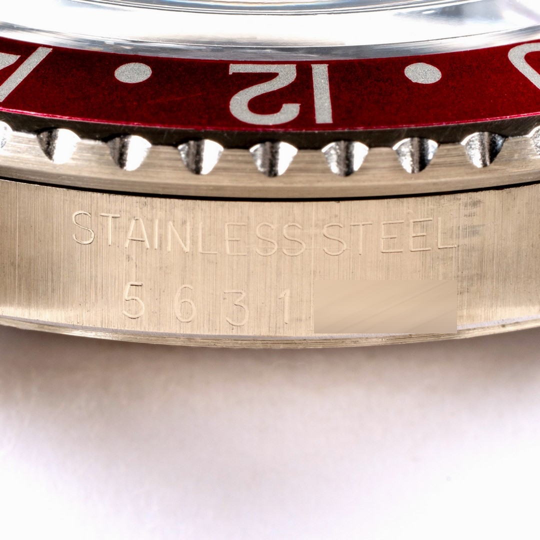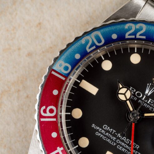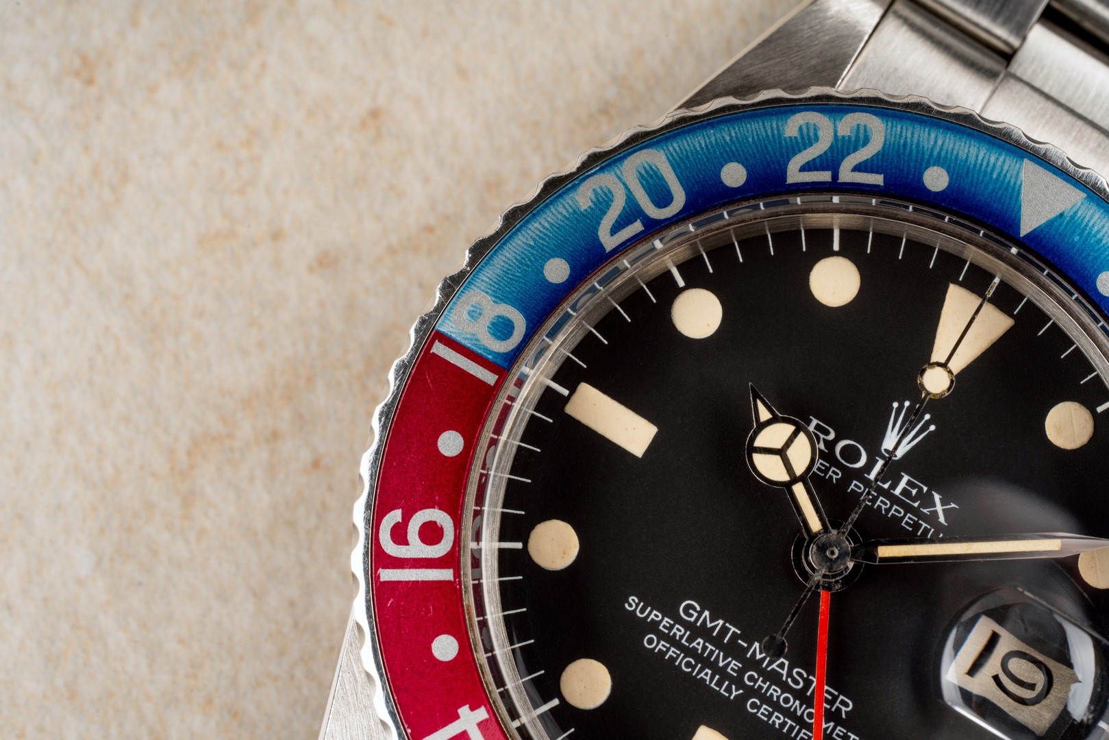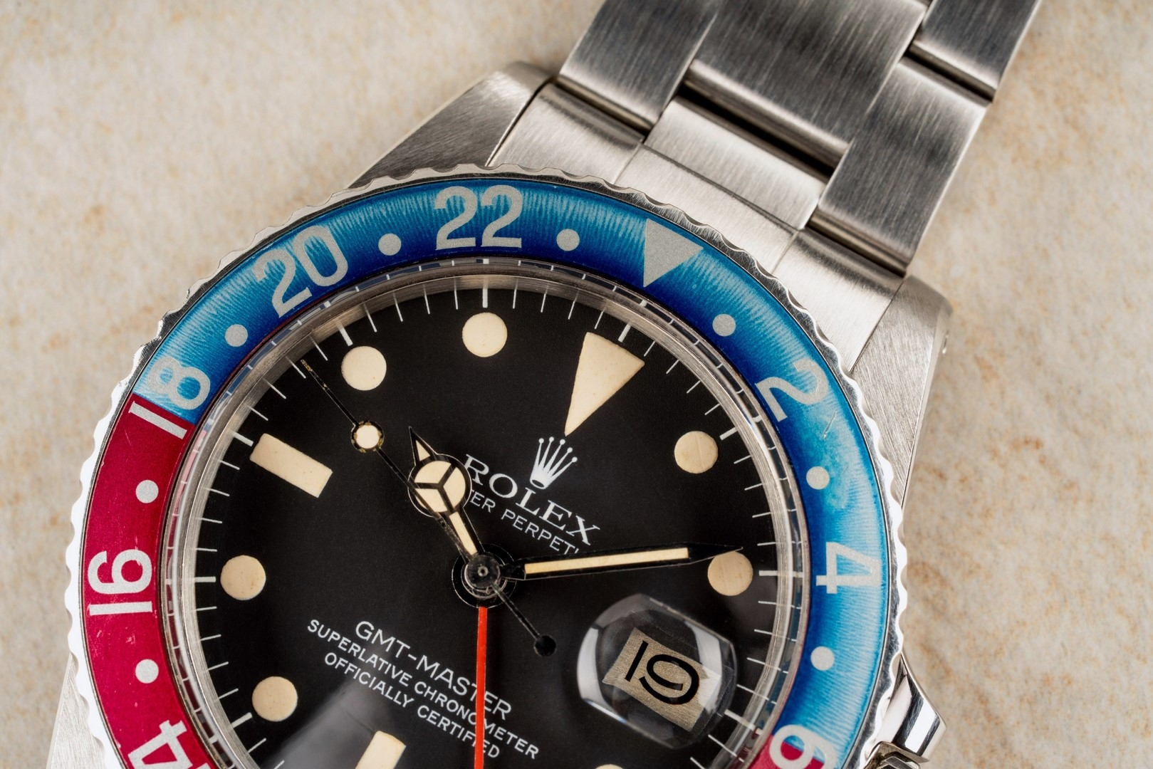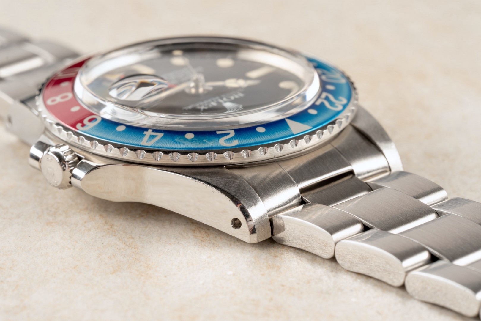 Die Lünette ist noch wunderbar scharf und wie die Bilder zeigen, kommt die Uhr mit einem herrlichen Pepsi Inlay mit roter Rückseite, sogenanntes redback. Die Alterung des Inlays ist wirklich extrem schön und passt perfekt zur Patina des Zifferblattes.