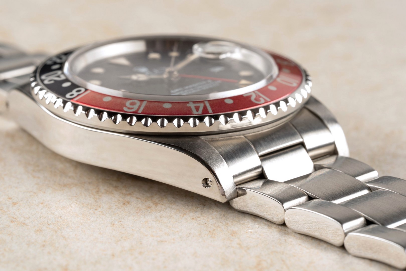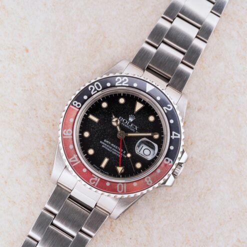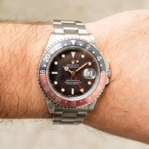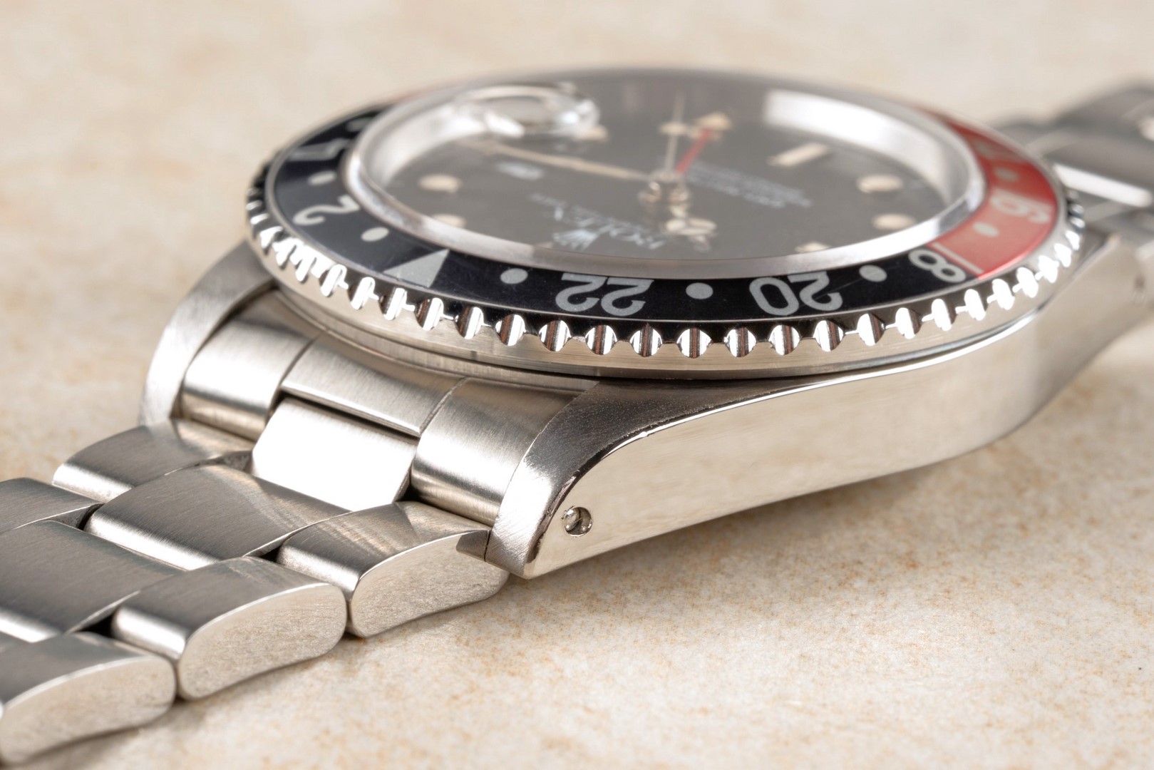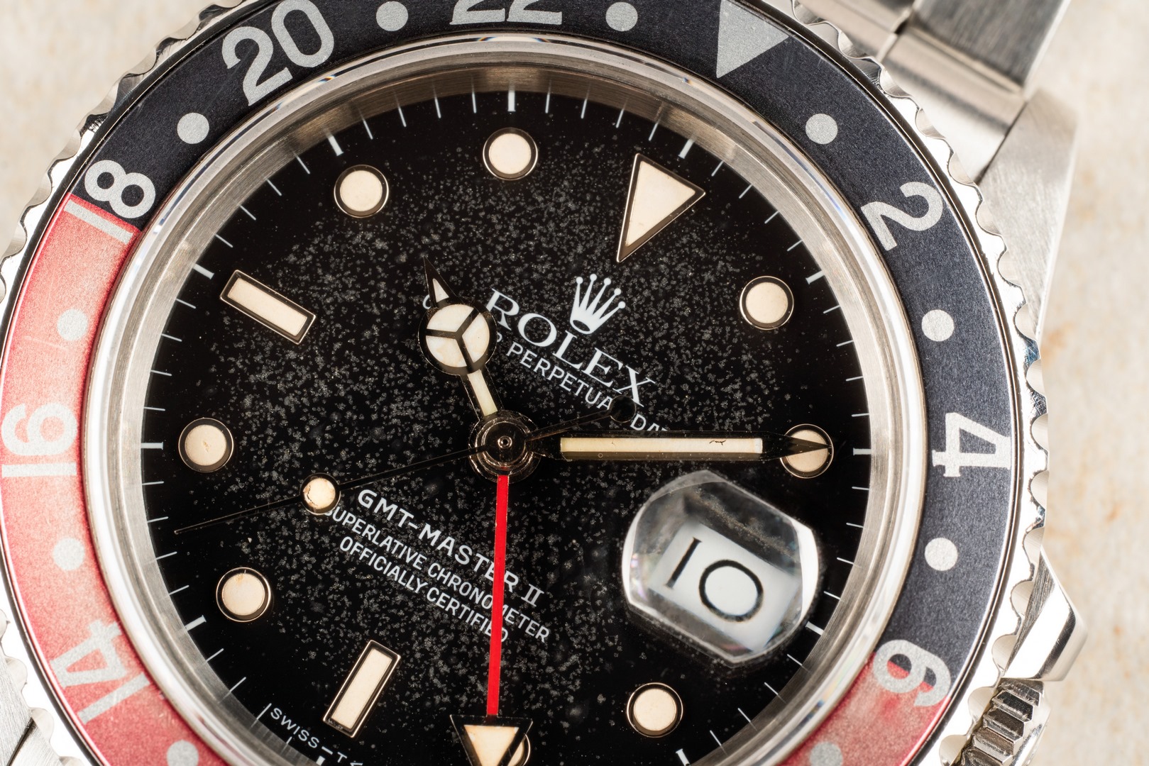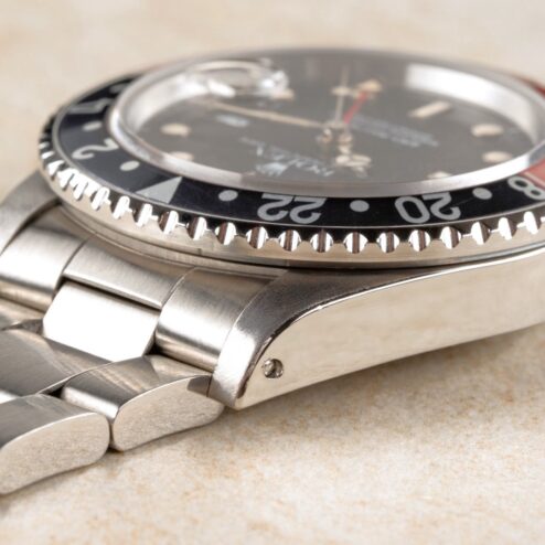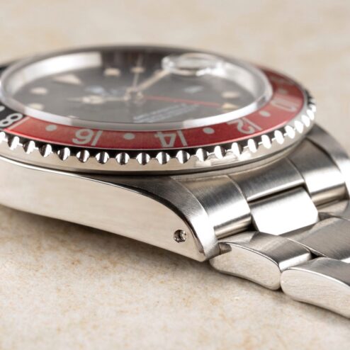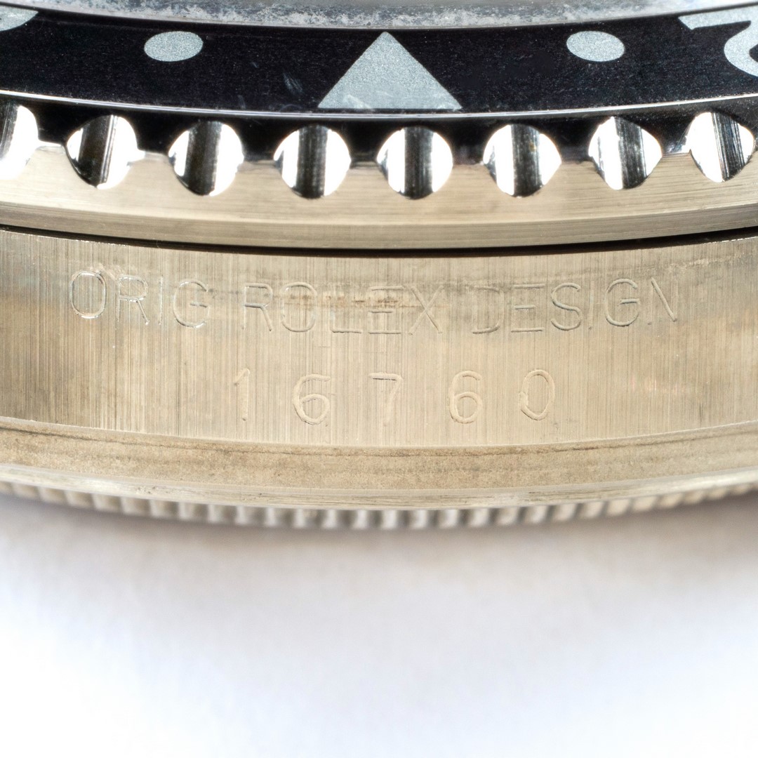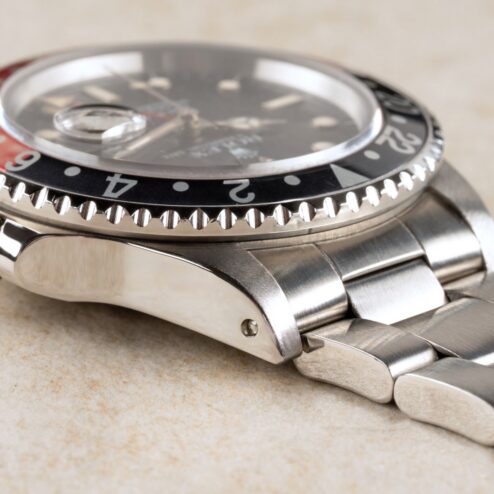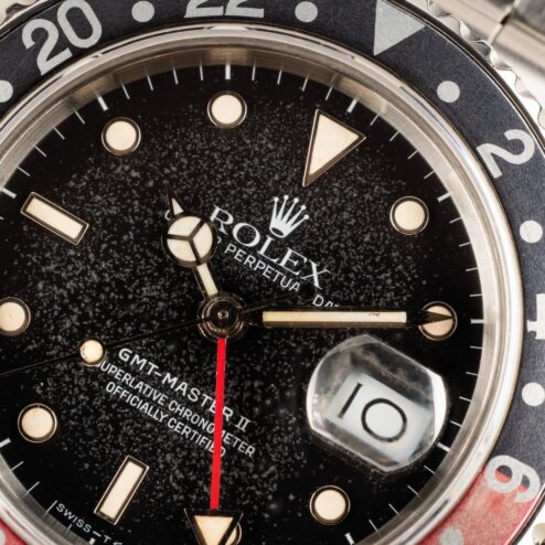 Das GMT-Master II Zifferblatt ist besonders. Wie die Bilder sofort zeigen, hat das Blatt im Laufe der Jahrzehnte eine wunderbare Patina angenommen. Diese entsteht, wenn sich die oberste Lackschicht verändert und leicht matt wird. Unter Sammler wird dieser Effekt als „Stardust“ bezeichnet, da diese Blätter wie ein Sternenhimmel wirken. Neben diesem coolen Feature ist auch die Leuchtmasse wunderbar. Diese hat nämlich im Laufe der Jahrzehnte eine tolle kräftige Patina entwickelt.