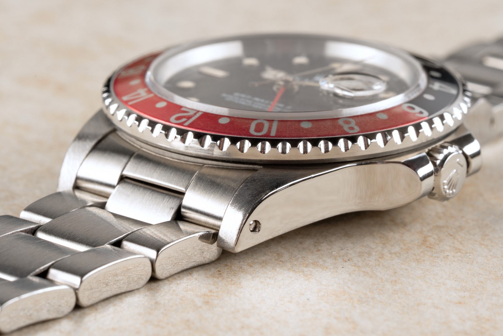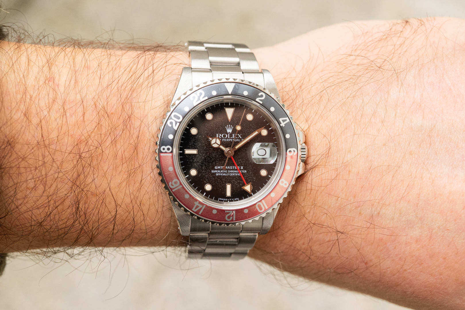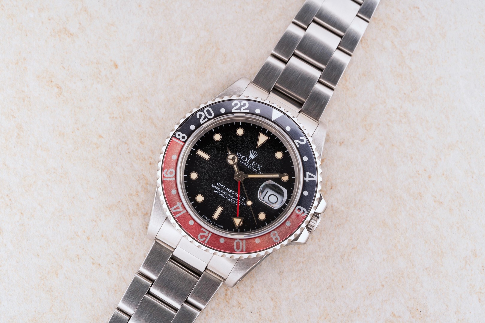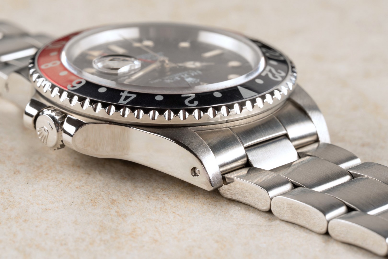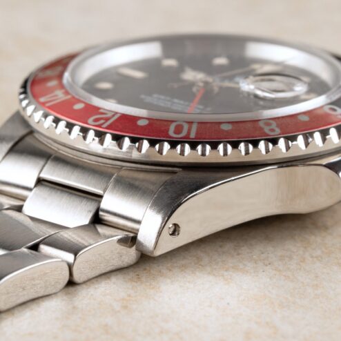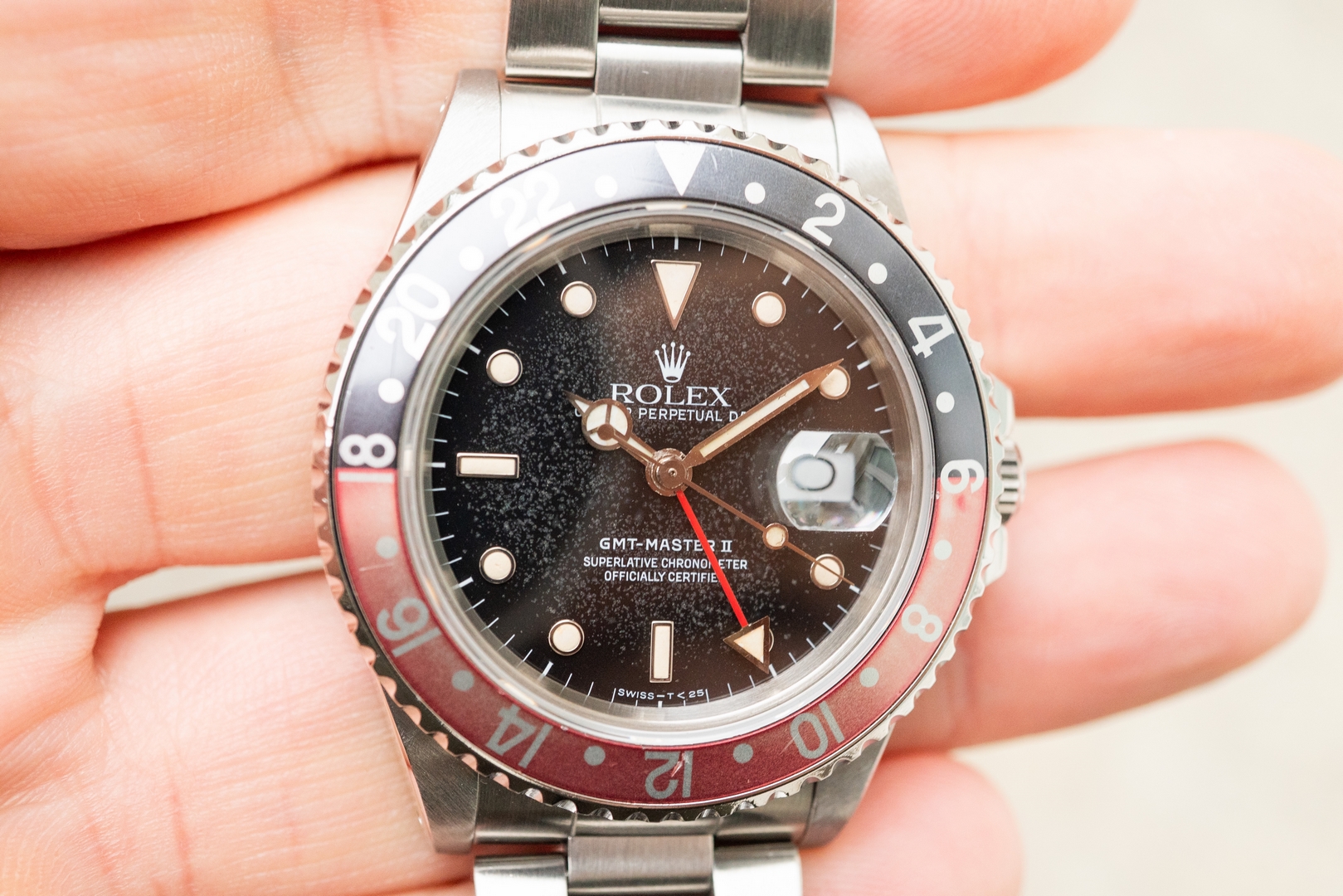 Das GMT-Master II Zifferblatt ist besonders. Wie die Bilder sofort zeigen, hat das Blatt im Laufe der Jahrzehnte eine wunderbare Patina angenommen. Diese entsteht, wenn sich die oberste Lackschicht verändert und leicht matt wird. Unter Sammler wird dieser Effekt als „Stardust“ bezeichnet, da diese Blätter wie ein Sternenhimmel wirken. Neben diesem coolen Feature ist auch die Leuchtmasse wunderbar. Diese hat nämlich im Laufe der Jahrzehnte eine tolle kräftige Patina entwickelt.