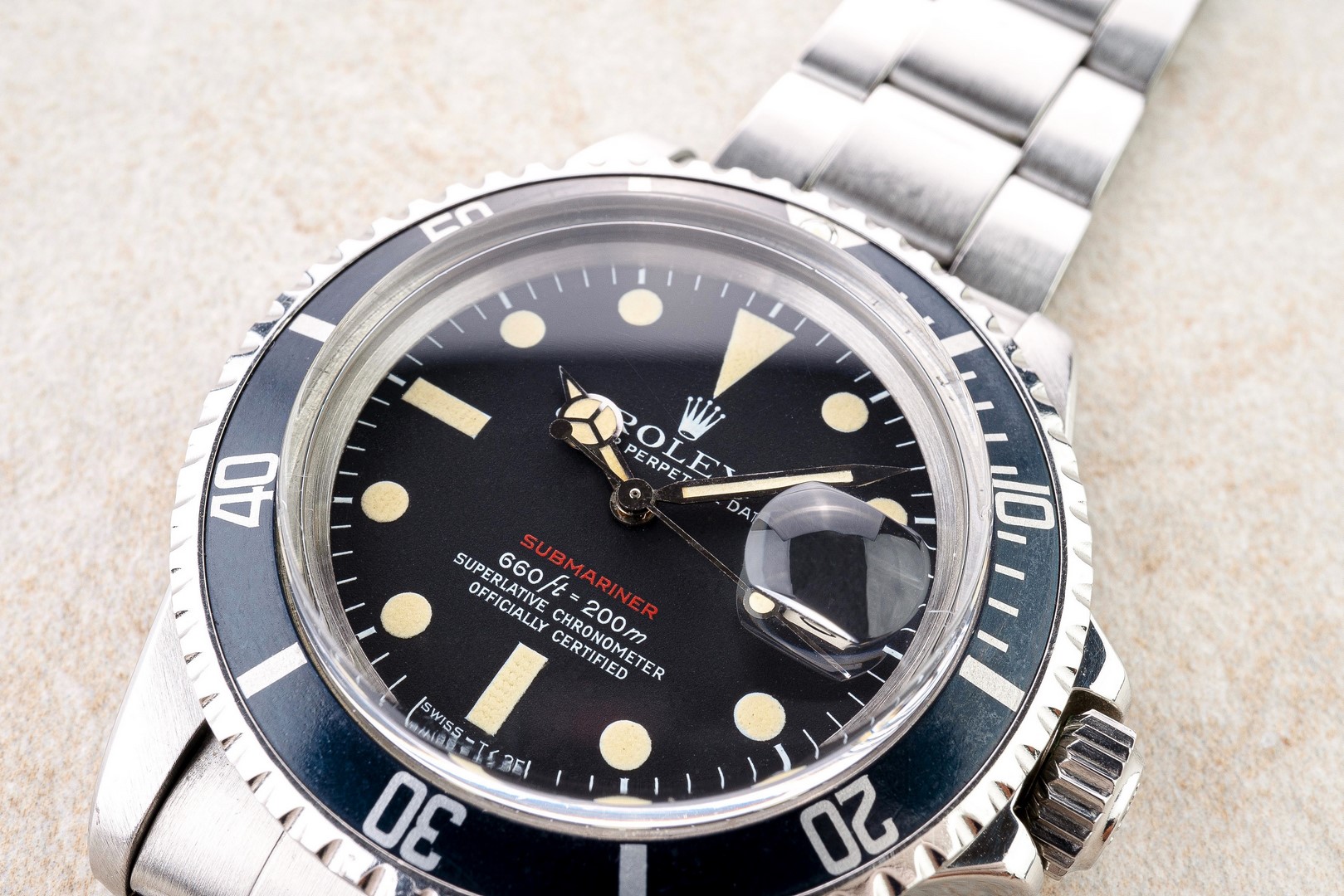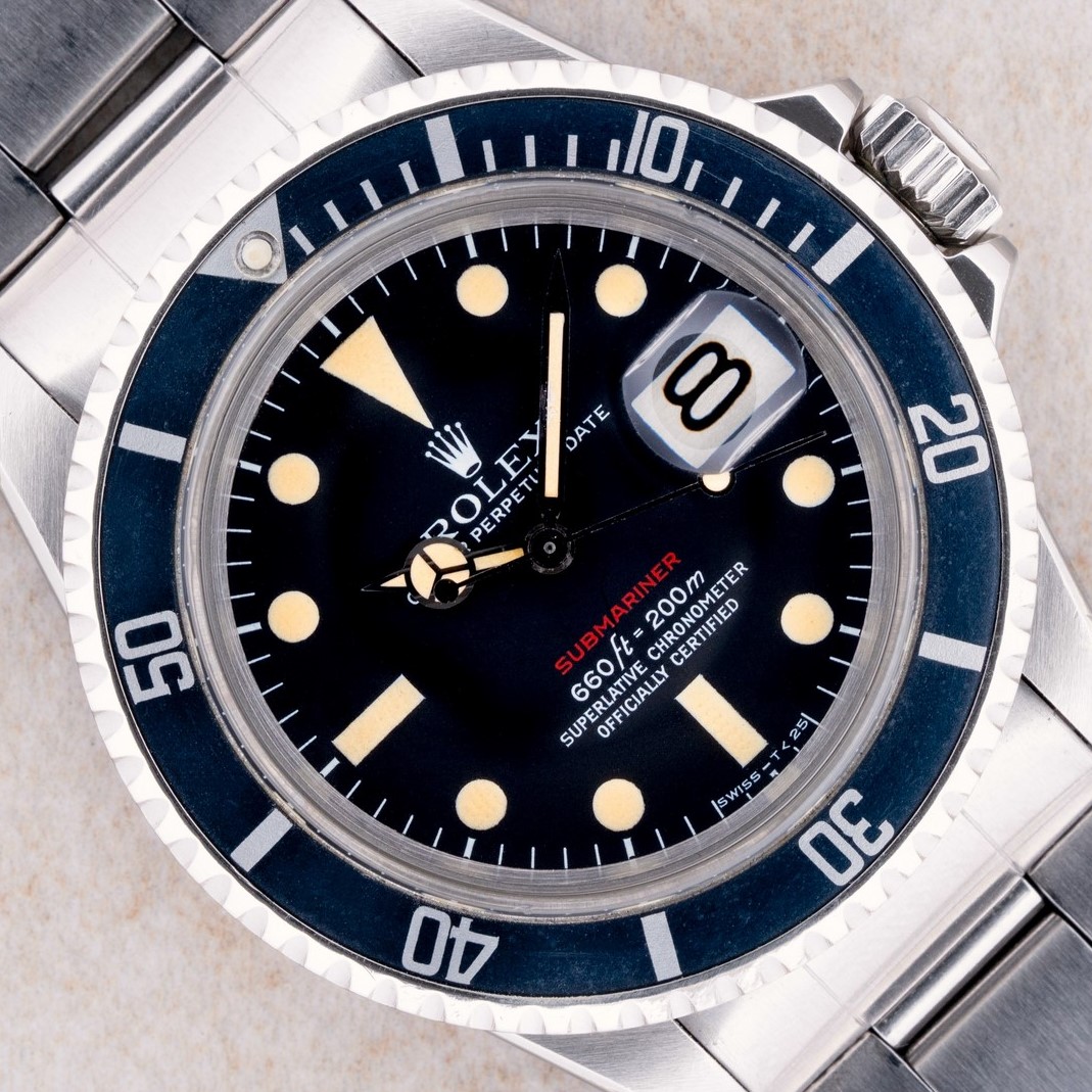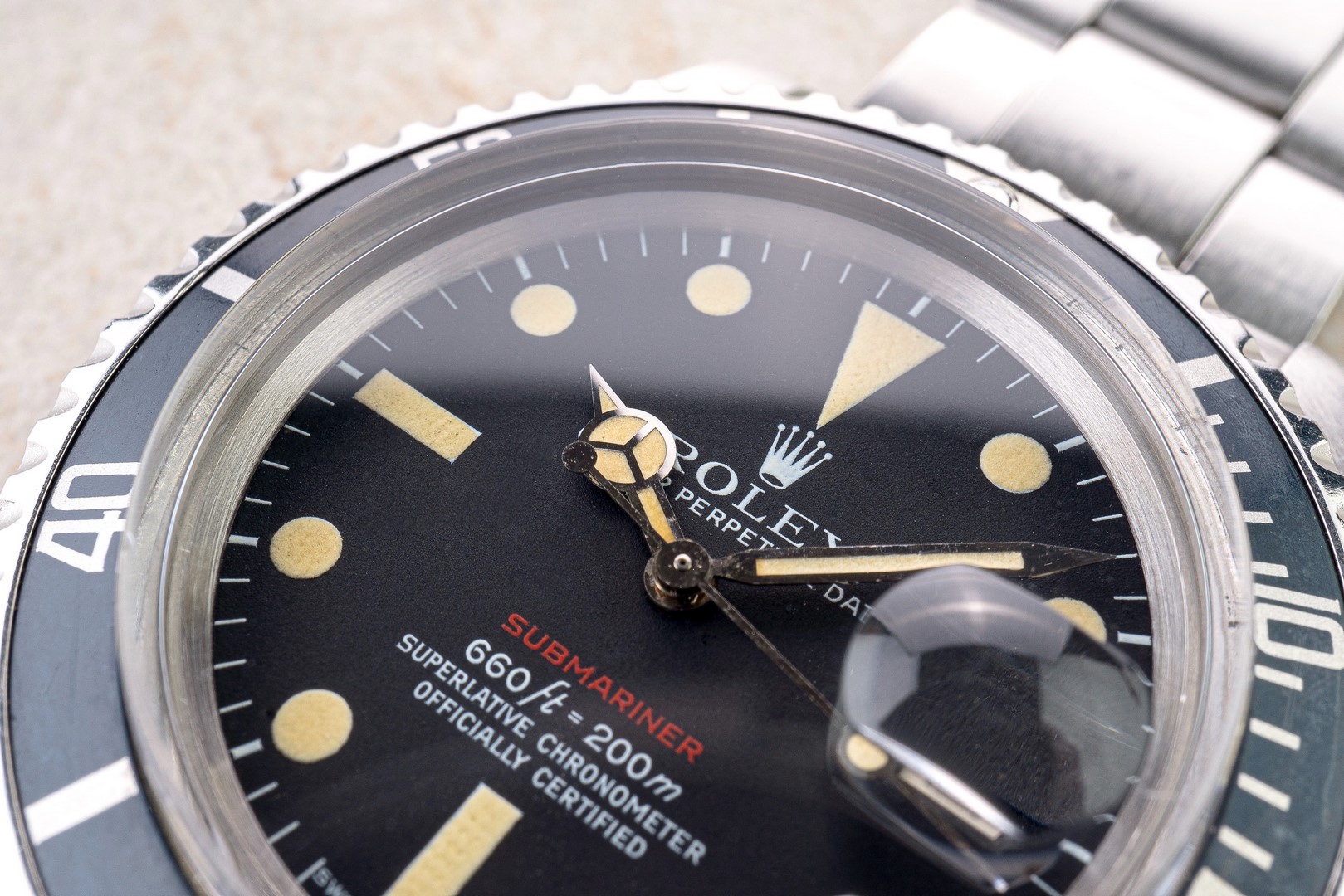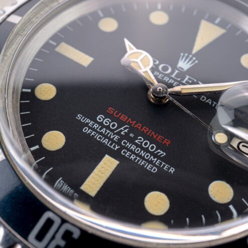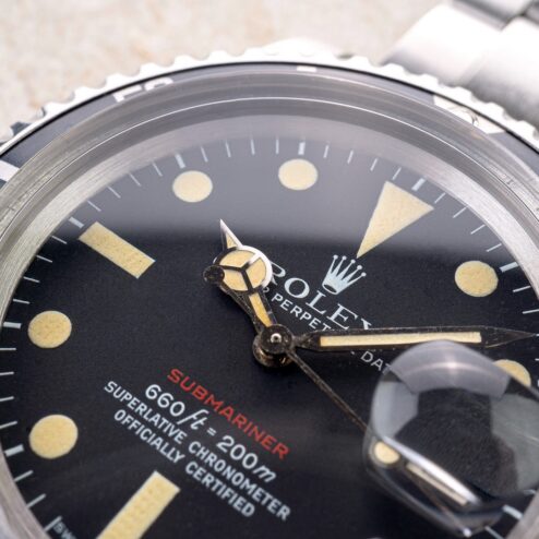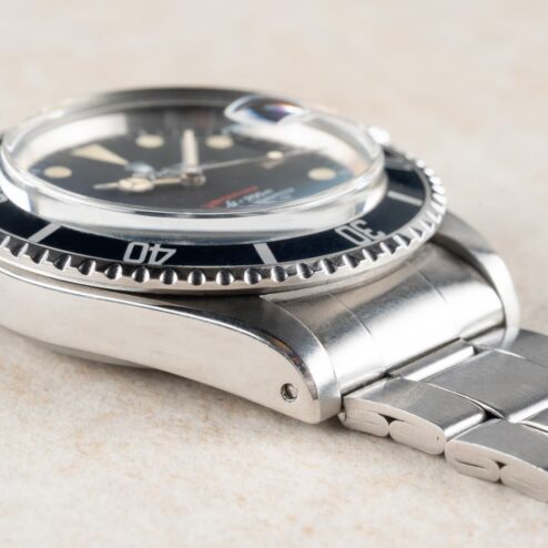 Das MK5 feet first Red Submariner Blatt ist im tollen Zustand. Voll intakt und mit klarem Druck, strahlt es seinem Betrachter entgegen. Die Tritiumleuchtmasse ist wunderbar in einen kräftigen Gelbton gealtert und ergibt ein schlicht tolles Bild.
