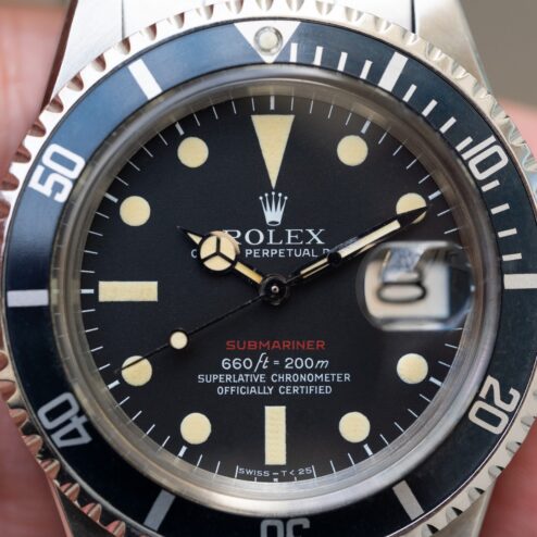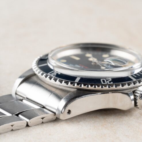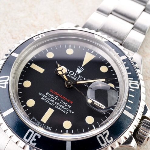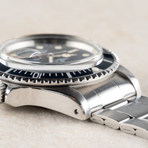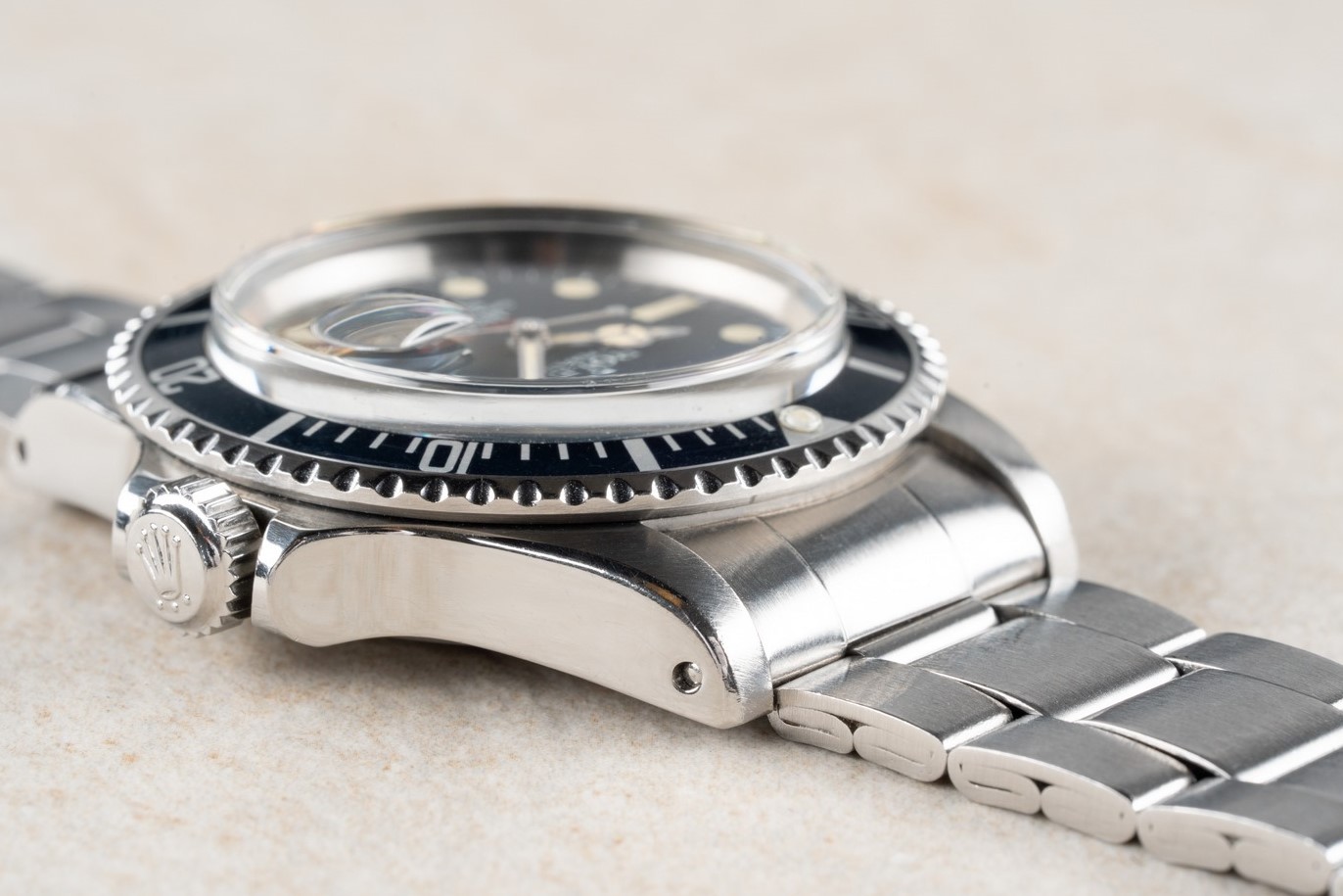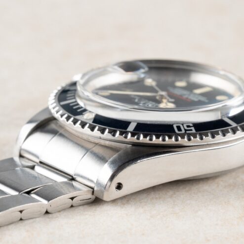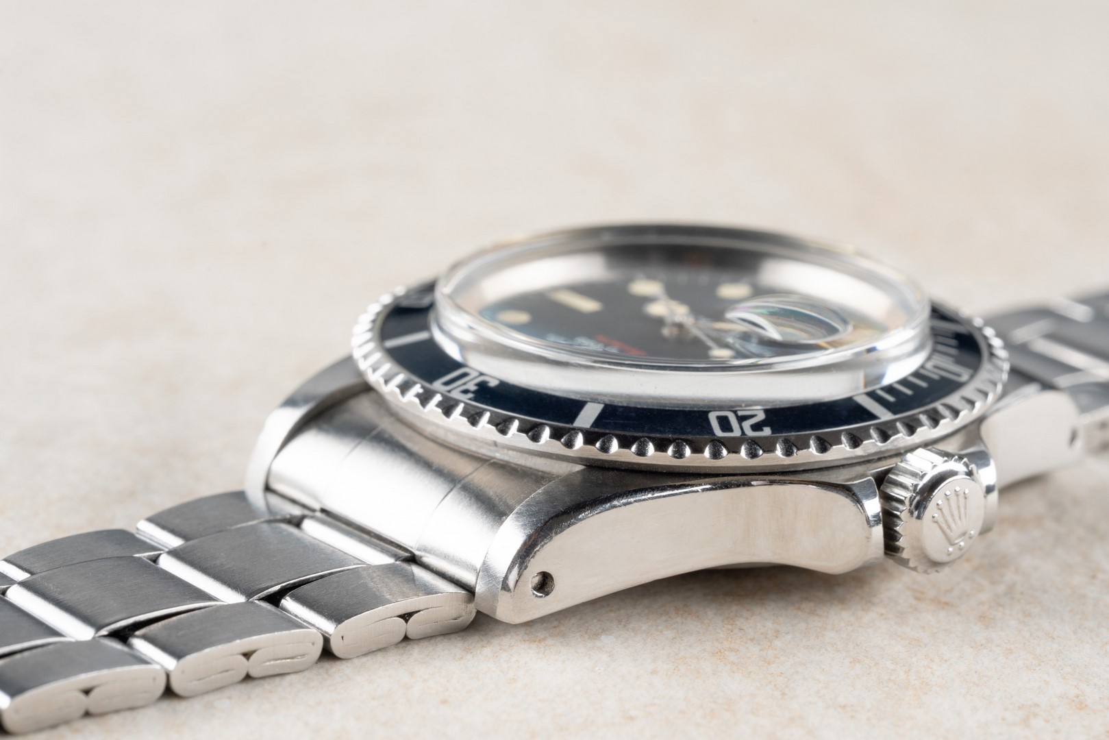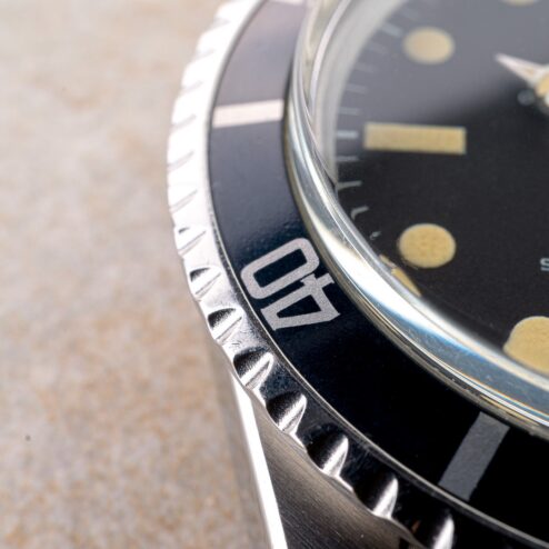Hinweisen möchte ich auch noch auf das Glas. Hierbei handelt es sich um die alte Version des Submariner Glases mit Lupe, welche keine Kante an der Oberseite aufweist. Man spricht hier von einem sogenannten „top hat“ Glas und diese Gläser sind heutzutage begehrt und selten zu bekommen.