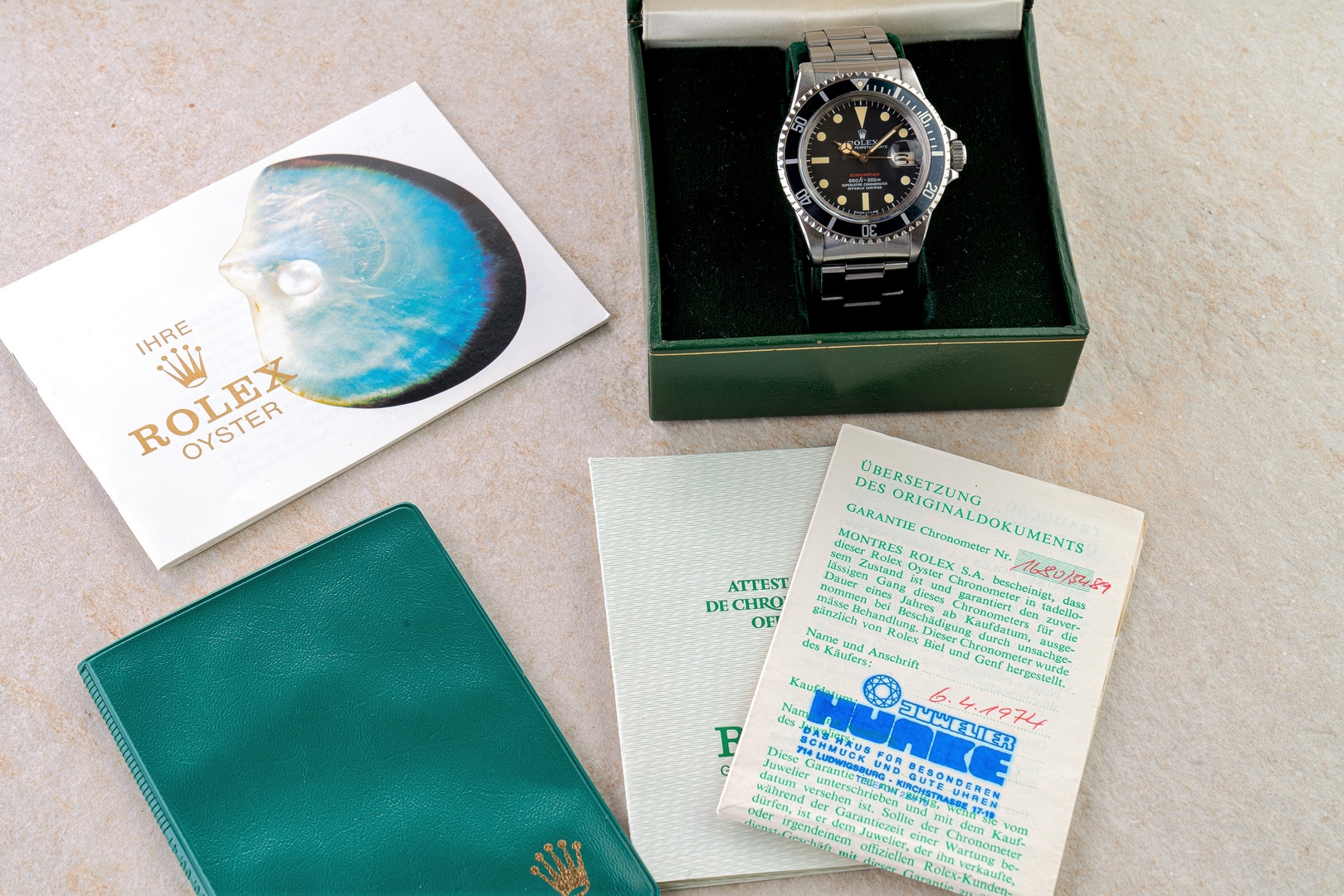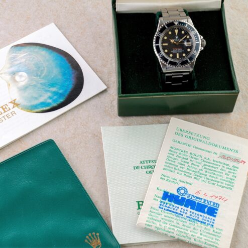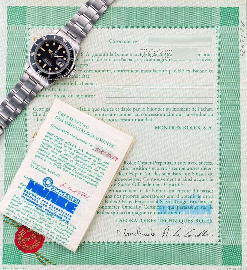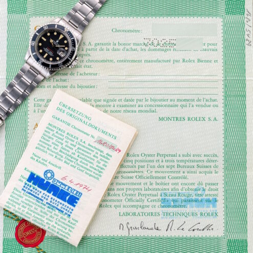 Wie vielleicht der Eingangssatz schon verraten hat, darf ich diese tolle Red Submariner als Komplettpaket anbieten. Sie wurde am 06.04.1974 von Juwelier Hunke in Ludwigsburg verkauft. Der Konzessionär hat hierbei gleich beide relevanten Dokumente ausgefüllt. Die deutsche Übersetzung des Chronometer Zertifikates ist mit der Referenznummer, der internen Nummer des Konzessionärs, sowie Stempel und Verkaufsdatum versehen. Ferner ist die interne Nummer auf dem Originalzertifikat oben rechts notiert und das Originalzertifikat wurde an der Außenseite auch entsprechend abgestempelt. Deutsche Gründlichkeit würde ich da sagen 😉