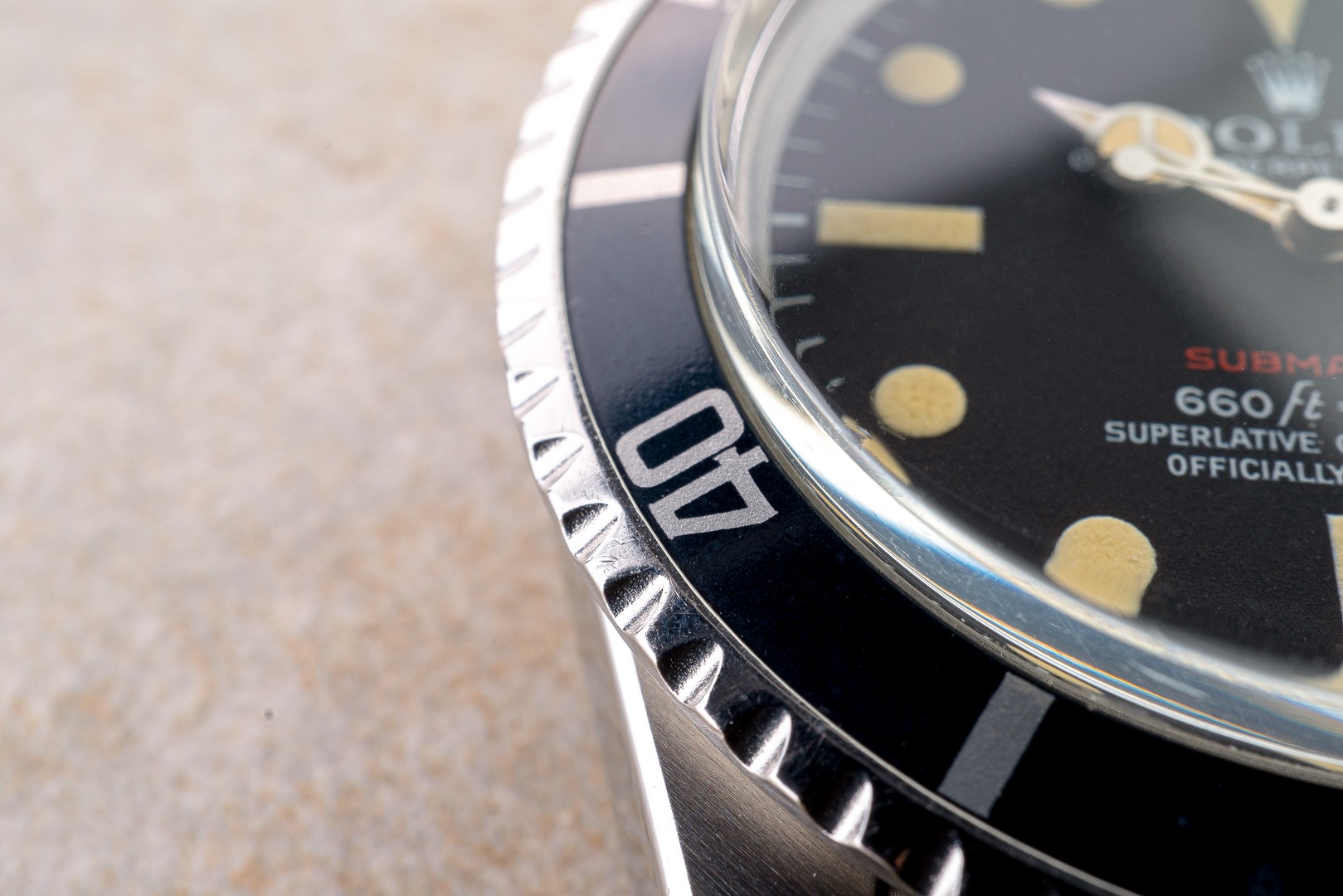 Die MK3 Lünetteneinlage mit dick gedruckten Zahlen ist, passend zur Patina des Blattes, in einen kräftigen blauton gealtert und präsentiert sich mit geringen Tragespuren und natürlich passendem Tiritumleuchtpunkt.