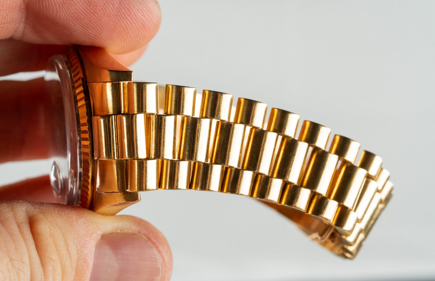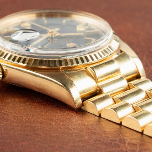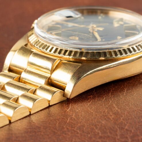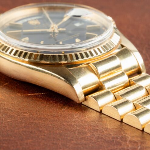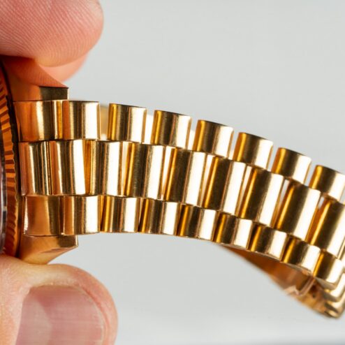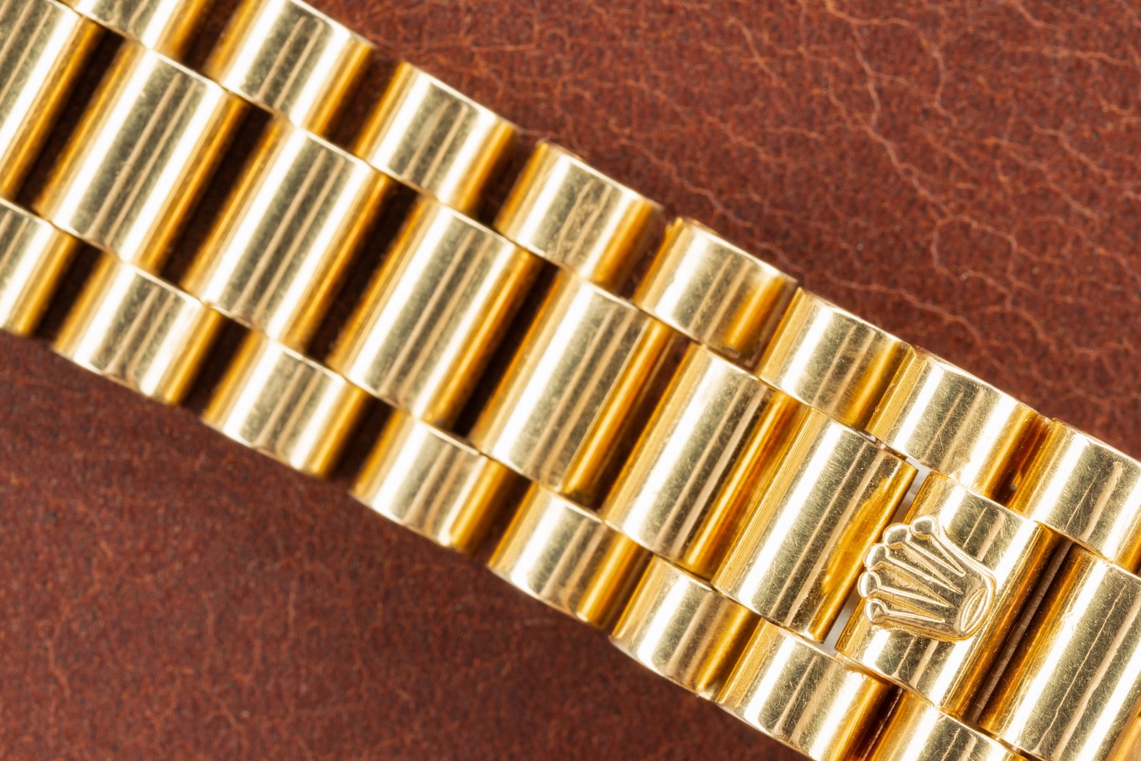 Das 8385 Präsident-Armband ist fein und ebenso besonders. Nicht viele 1803 wurden mit verdeckter Schließe ausgeliefert. Diese hat die verdeckte Schließe. Ferner ist das Band ebenso unpoliert mit perfekt intakter Krone. Leichter Stretch ist vorhanden, aber das Band trägt sich perfekt und kommt mit allen 24 Gliedern.