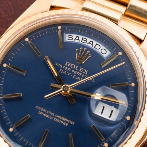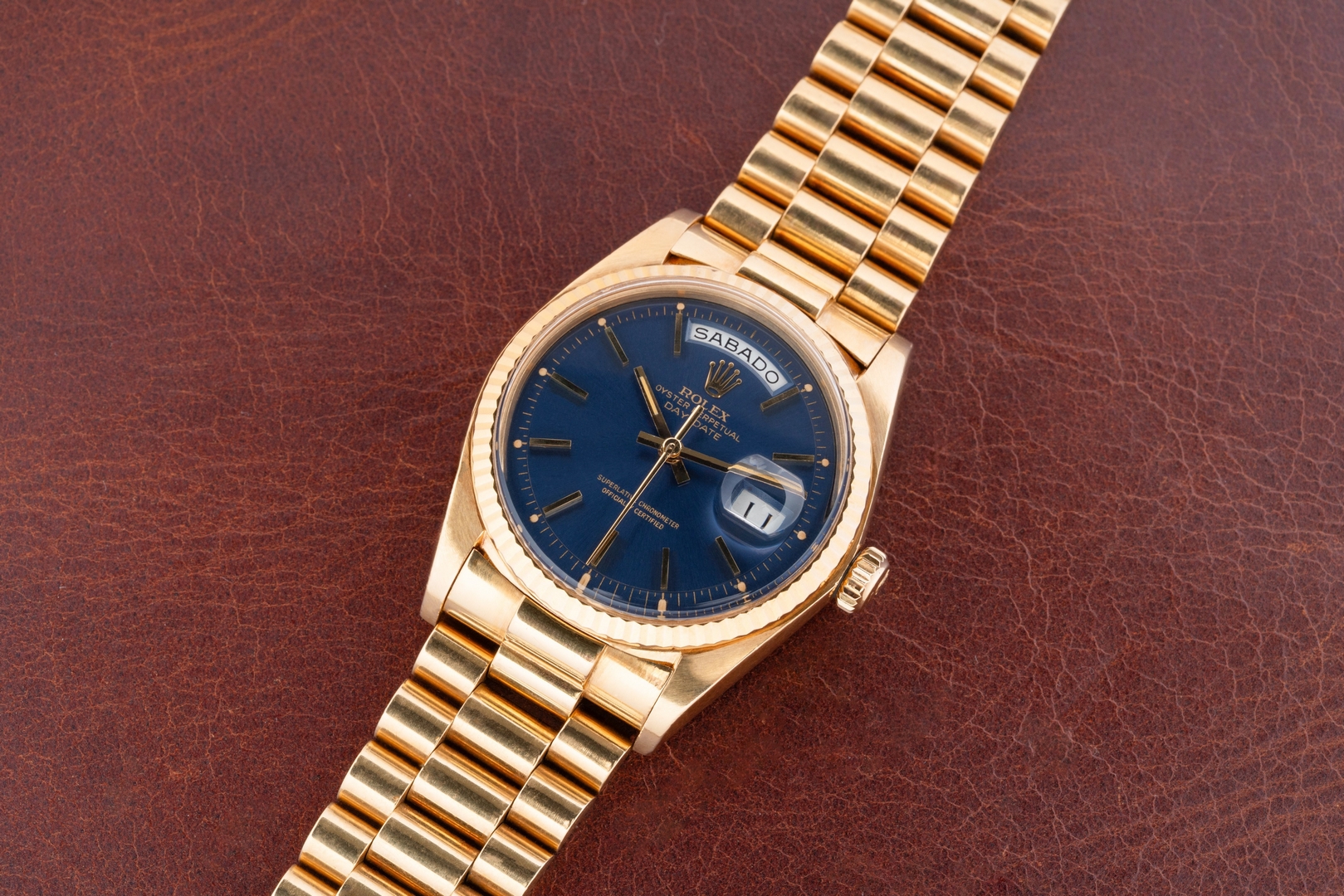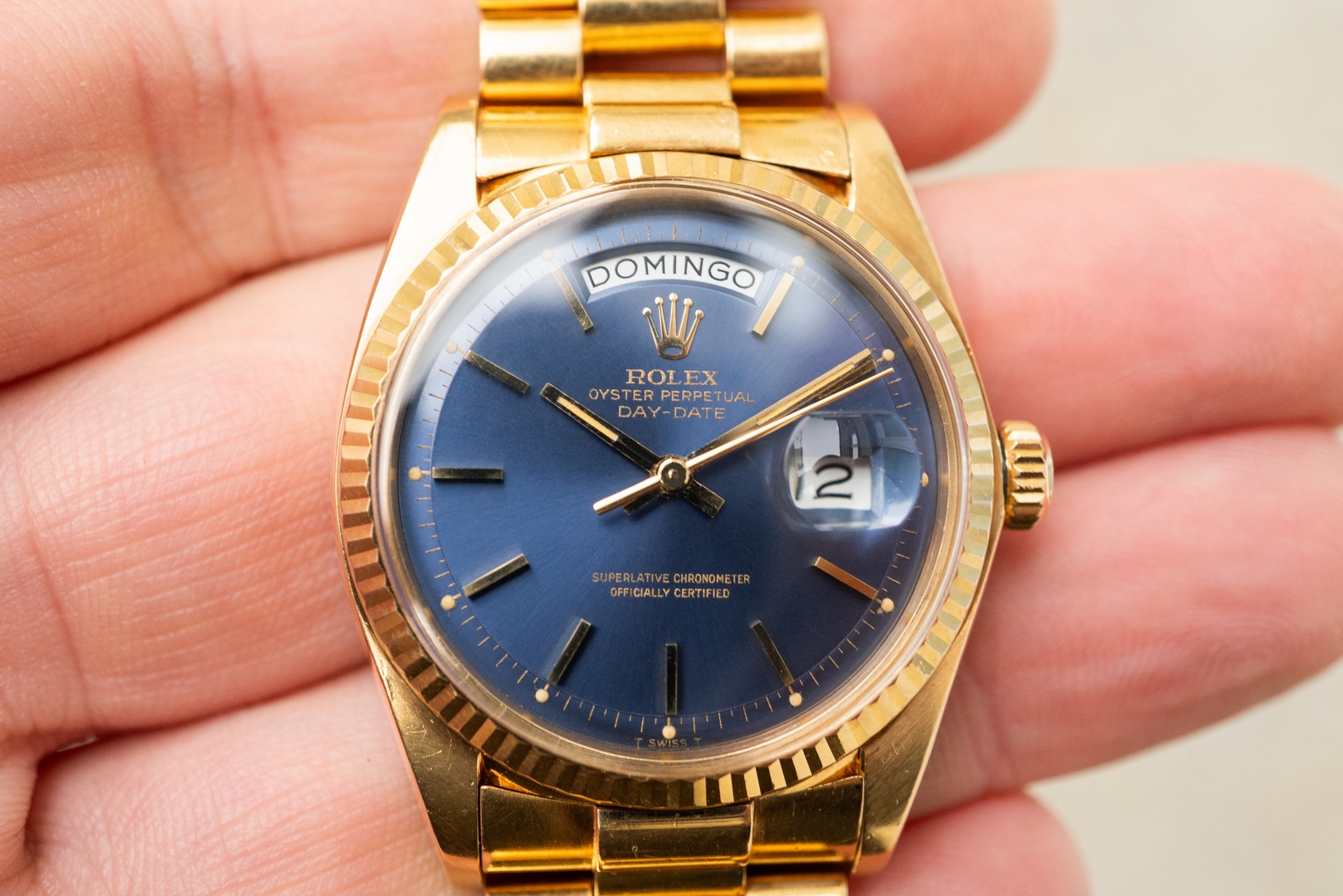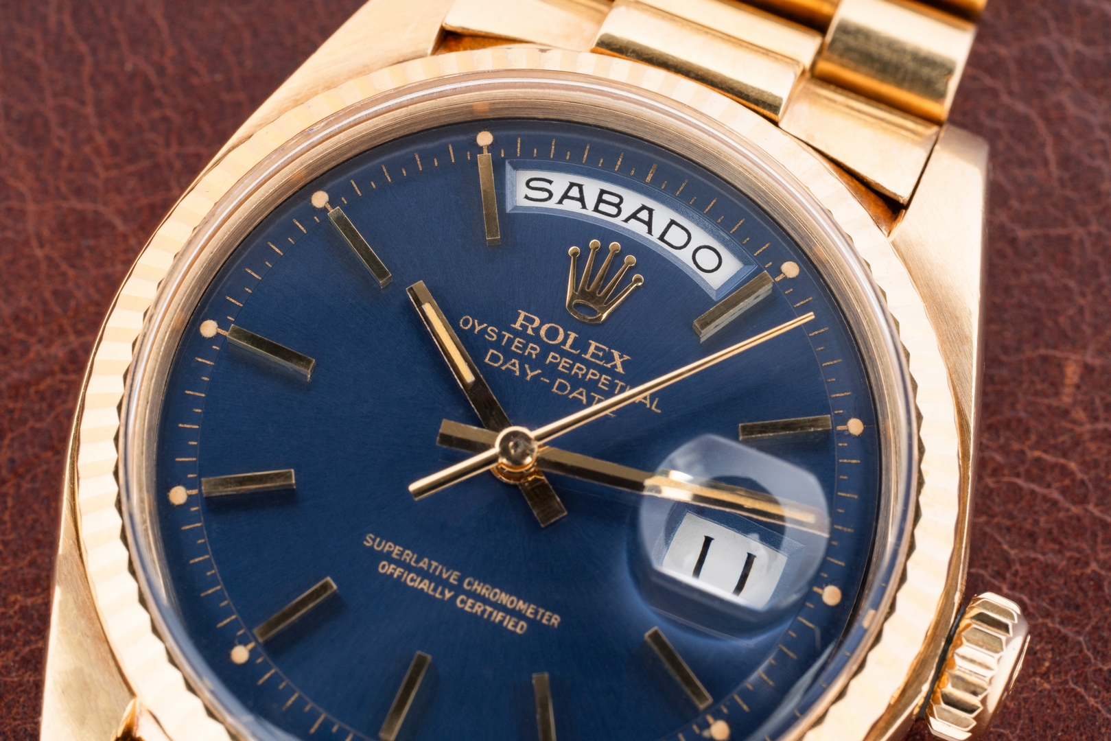 Beschreibung: Wundervolle und unpolierte 1803 Day-Date mit petrol-blauem Sonnenschliffzifferblatt.