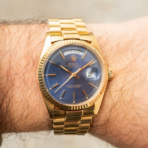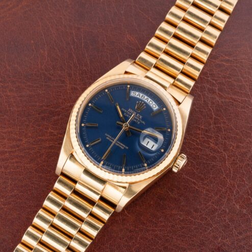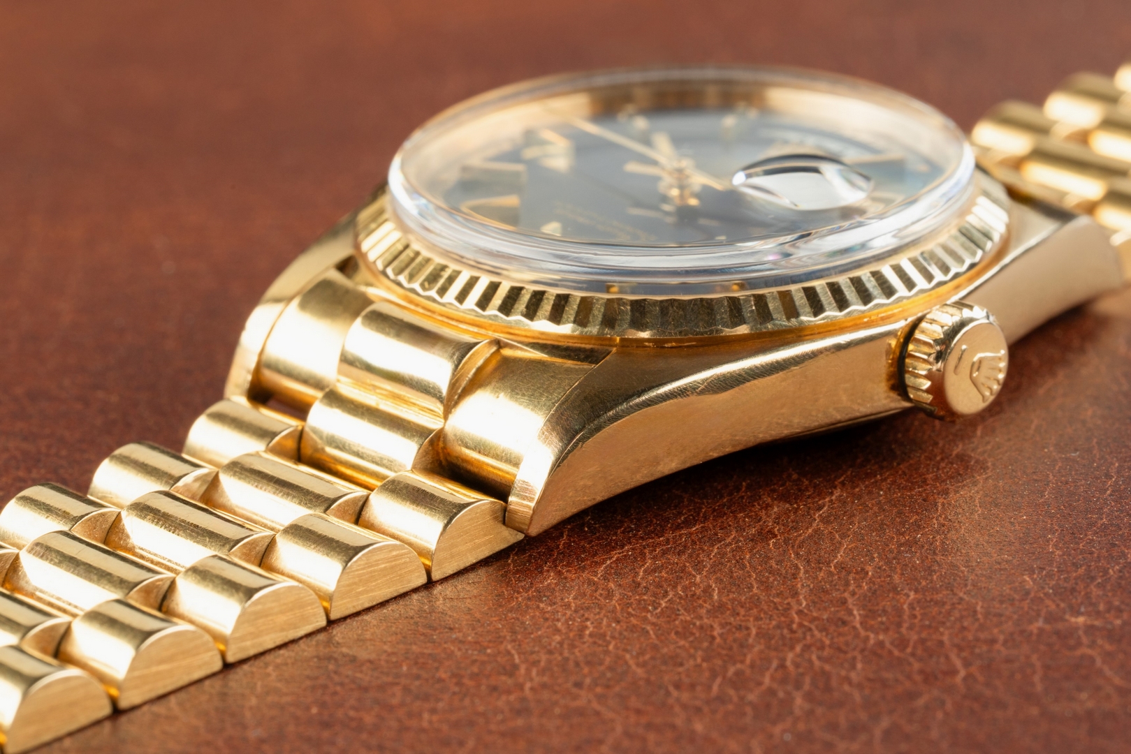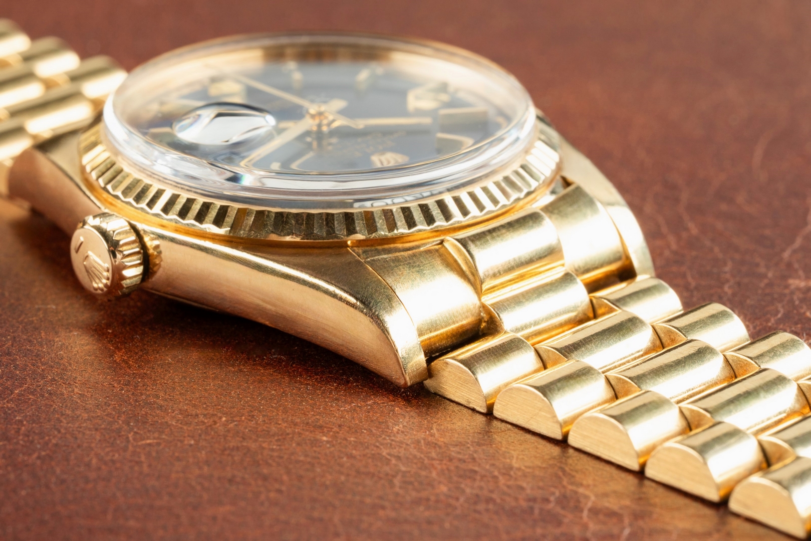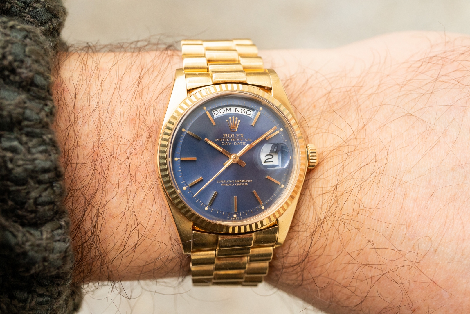 Beschreibung: Wundervolle und unpolierte 1803 Day-Date mit petrol-blauem Sonnenschliffzifferblatt.