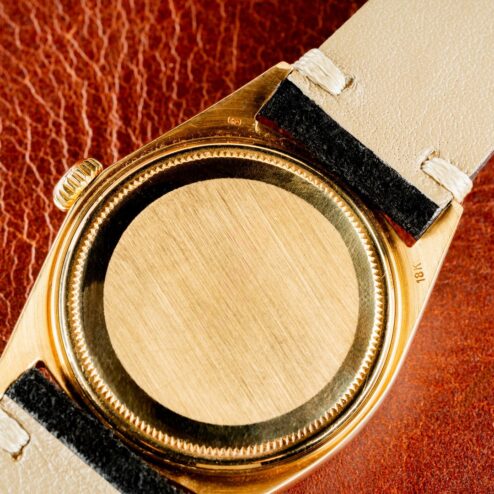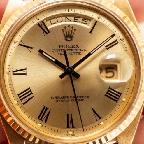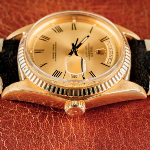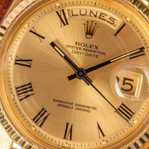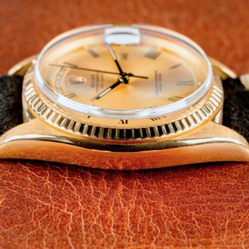 Ein Highlight dieser 1803 Day-Date ist das seltene Zifferblatt. Es handelt sich hier um ein sogenanntes „pre buckley“ Zifferblatt. Diese Blätter sind sehr selten und nur bis Anfang der 70iger Jahre in Day-Dates zu finden. Sie charakterisieren sich durch den Druck ihrer römischen Ziffern und der Anordnung dieser. Nicht nur das Blatt an sich, nein auch der Zustand ist ein Highlight. Absolut perfekt! Keinerlei Schwächen, alle Leuchtpunkte perfekt, eines der besten 1803 Blätter die wir anbieten durften.