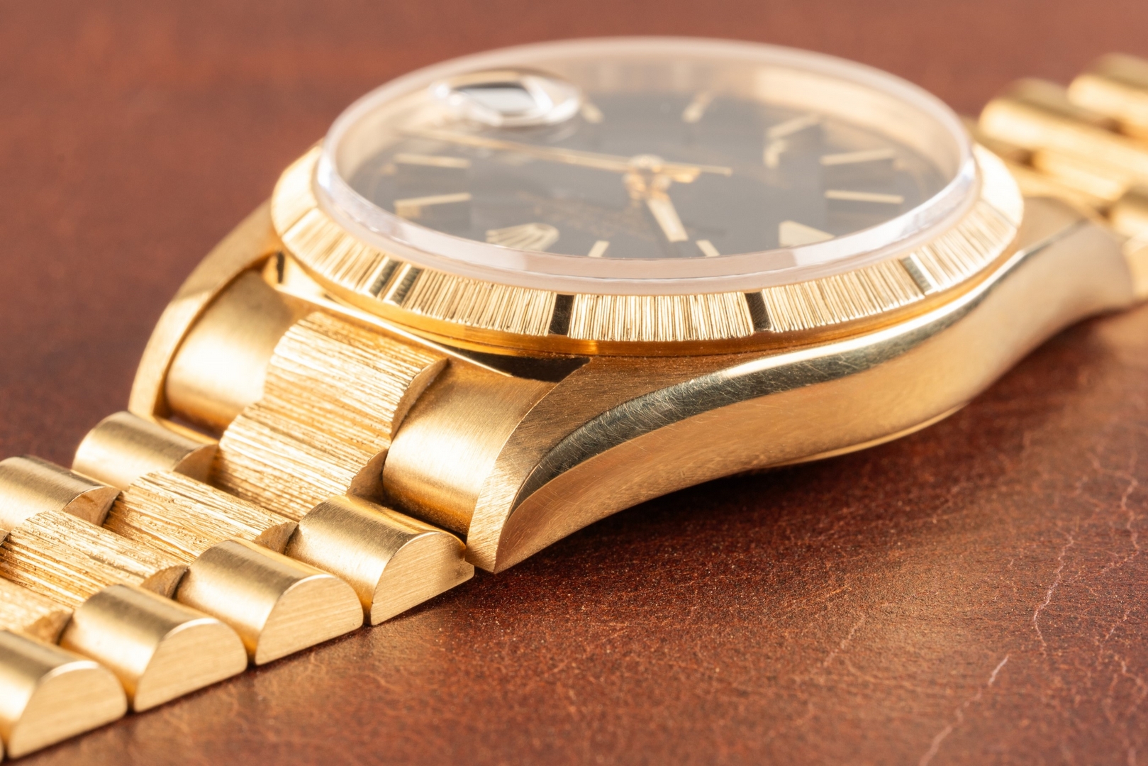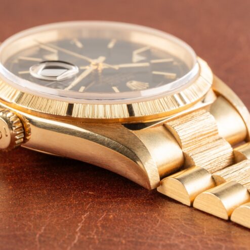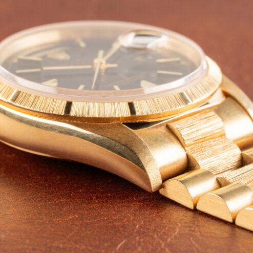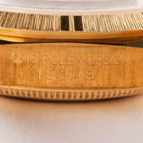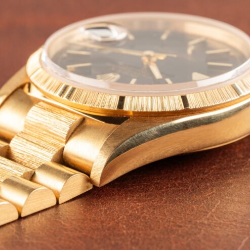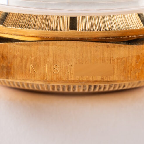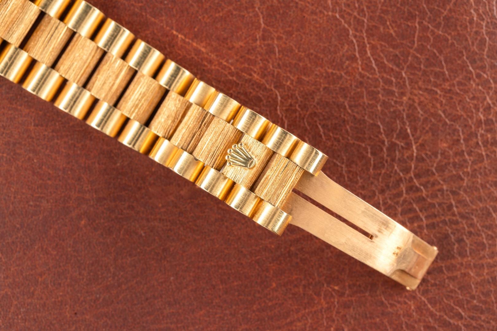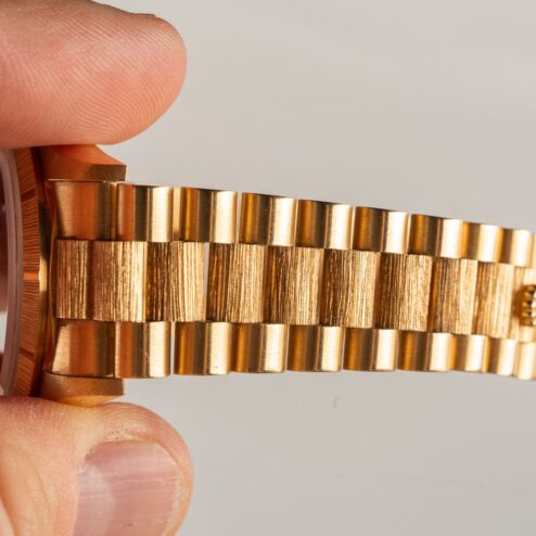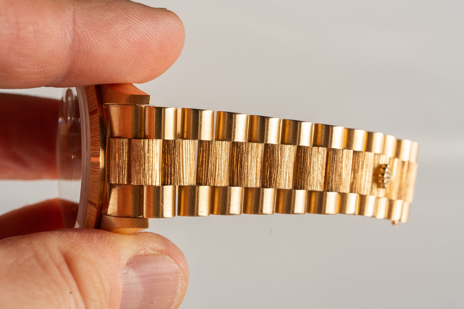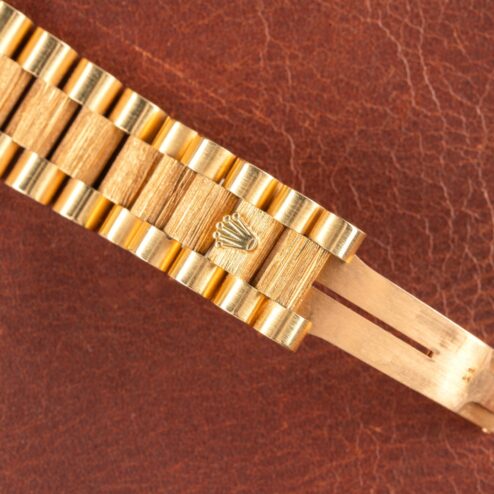 Das 8723 Präsident-Armband ist ebenso ein echtes Highlight. Perfekter Zustand ohne jeden Stretch und tolle Länge mit 23 Gliedern. Der Schließencode lautet S1 und da die Uhr direkt vom Erstbesitzer stammt erkennt man wieder, dass die Schließcodes bei Day-Dates so eine Sache sind. S1 steht eigentlich für Januar 1994, aber die Uhr wurde exakt mit diesem Band ausgeliefert. Rolex hat Goldbänder auf Lager produziert und dies in Chargen. Hier wurde eine frische Vorproduktion verwandt, wahrscheinlich weil man einfach keine anderen Borke Präsident Bänder auf Lager hatte.