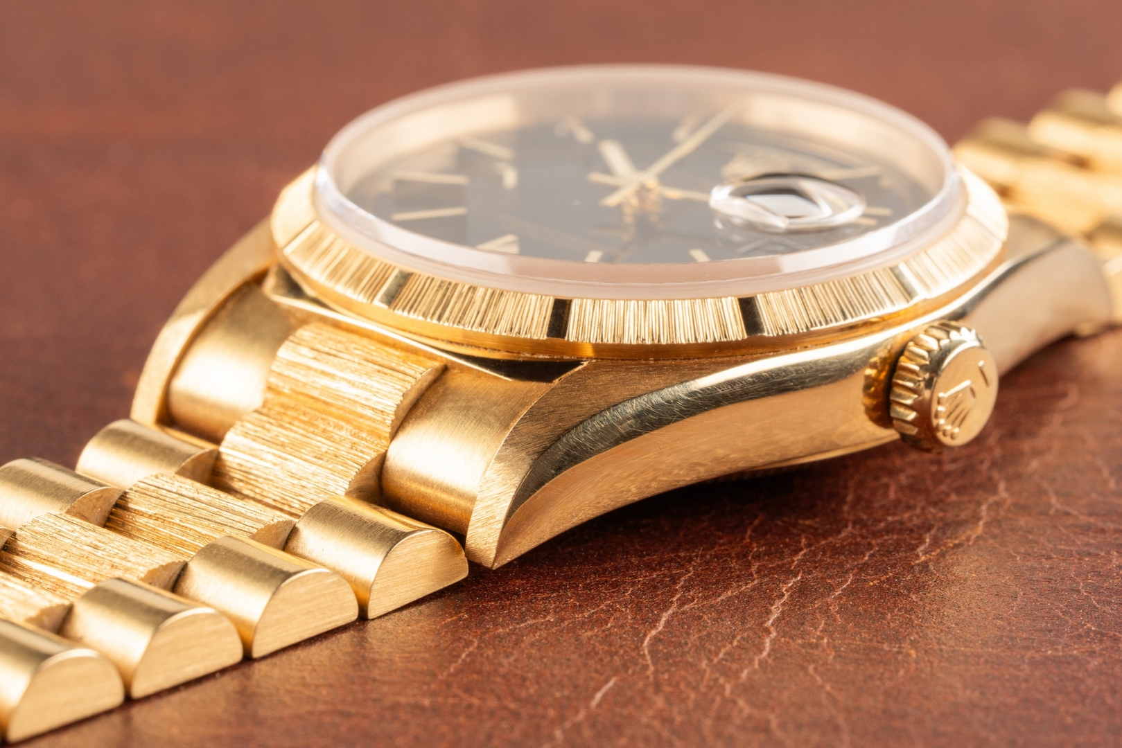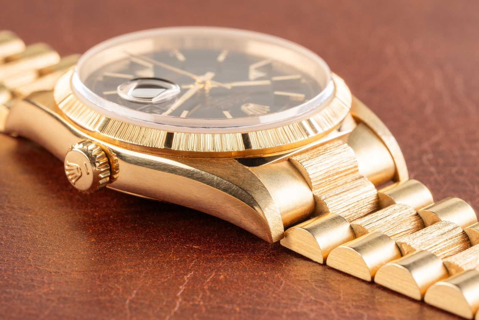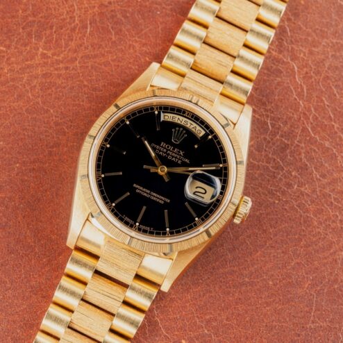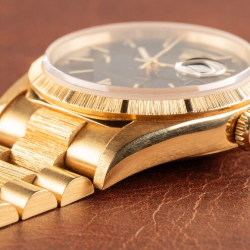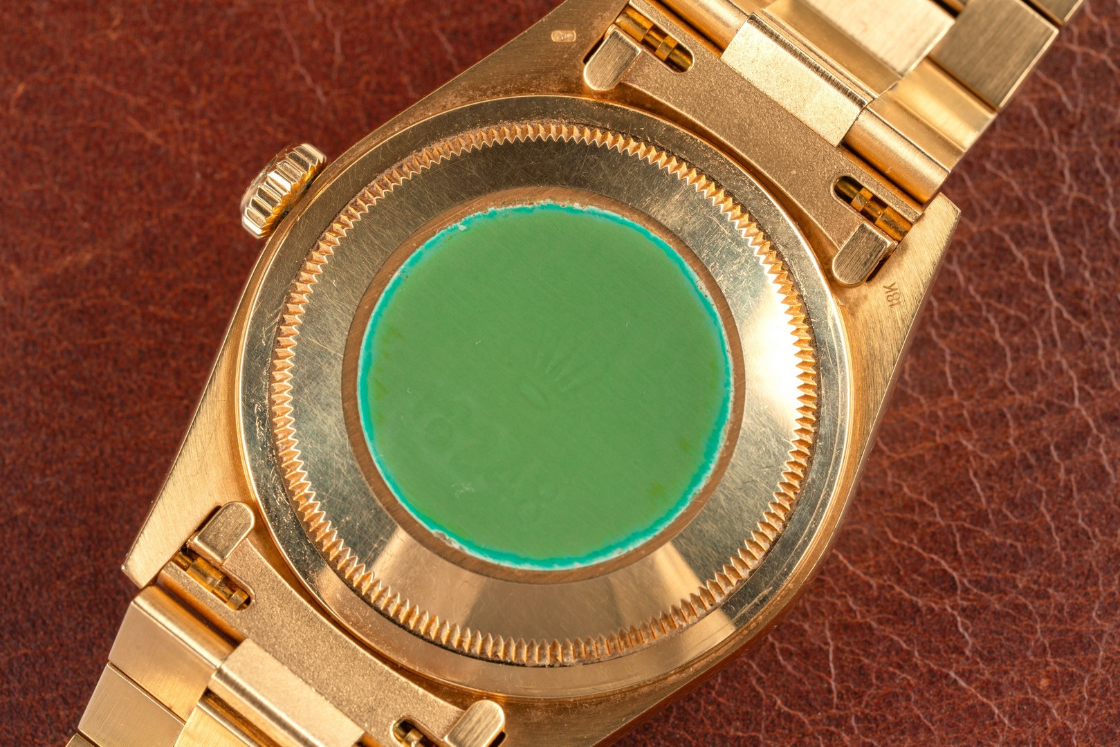 Das 8723 Präsident-Armband ist ebenso ein echtes Highlight. Perfekter Zustand ohne jeden Stretch und tolle Länge mit 23 Gliedern. Der Schließencode lautet S1 und da die Uhr direkt vom Erstbesitzer stammt erkennt man wieder, dass die Schließcodes bei Day-Dates so eine Sache sind. S1 steht eigentlich für Januar 1994, aber die Uhr wurde exakt mit diesem Band ausgeliefert. Rolex hat Goldbänder auf Lager produziert und dies in Chargen. Hier wurde eine frische Vorproduktion verwandt, wahrscheinlich weil man einfach keine anderen Borke Präsident Bänder auf Lager hatte.
