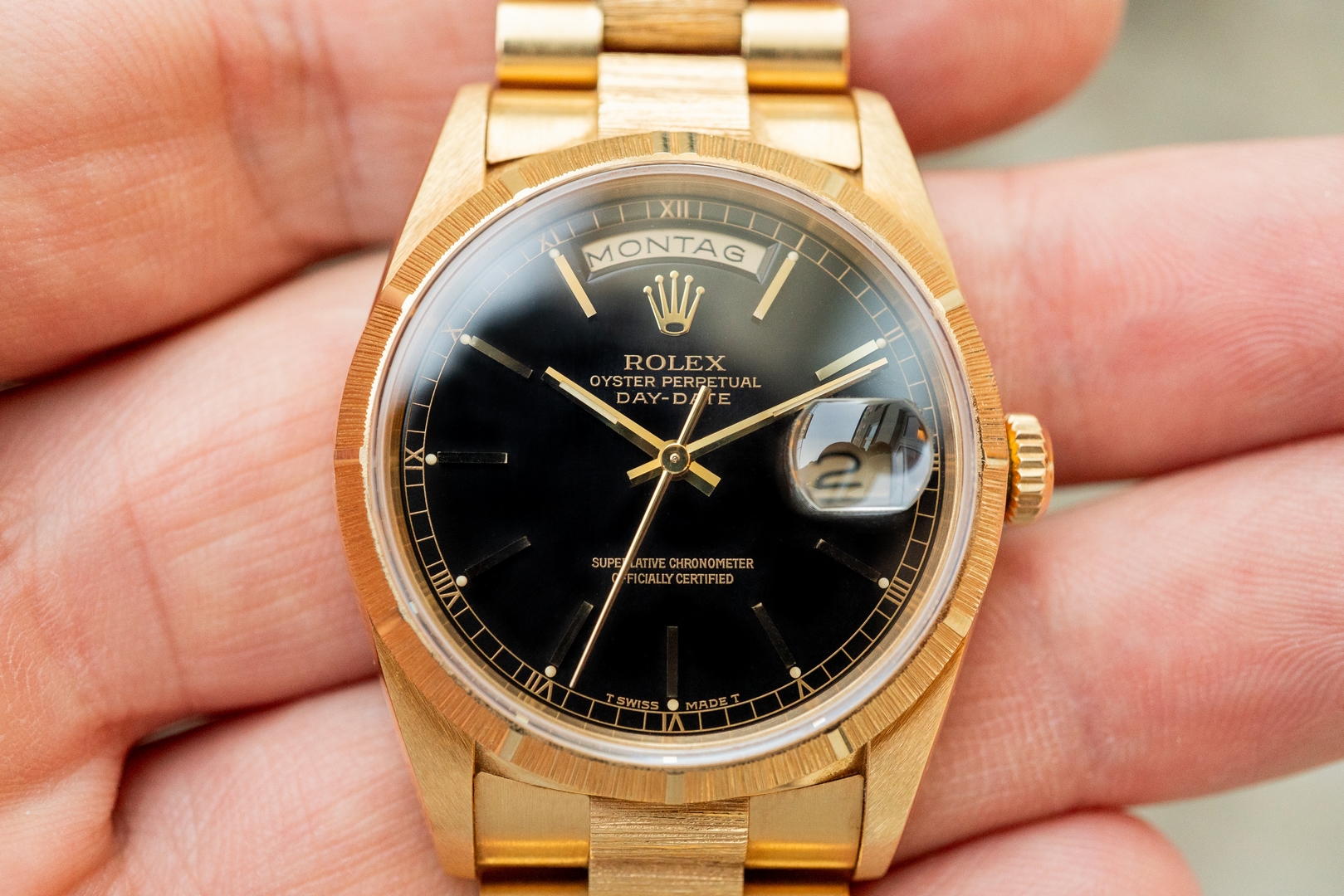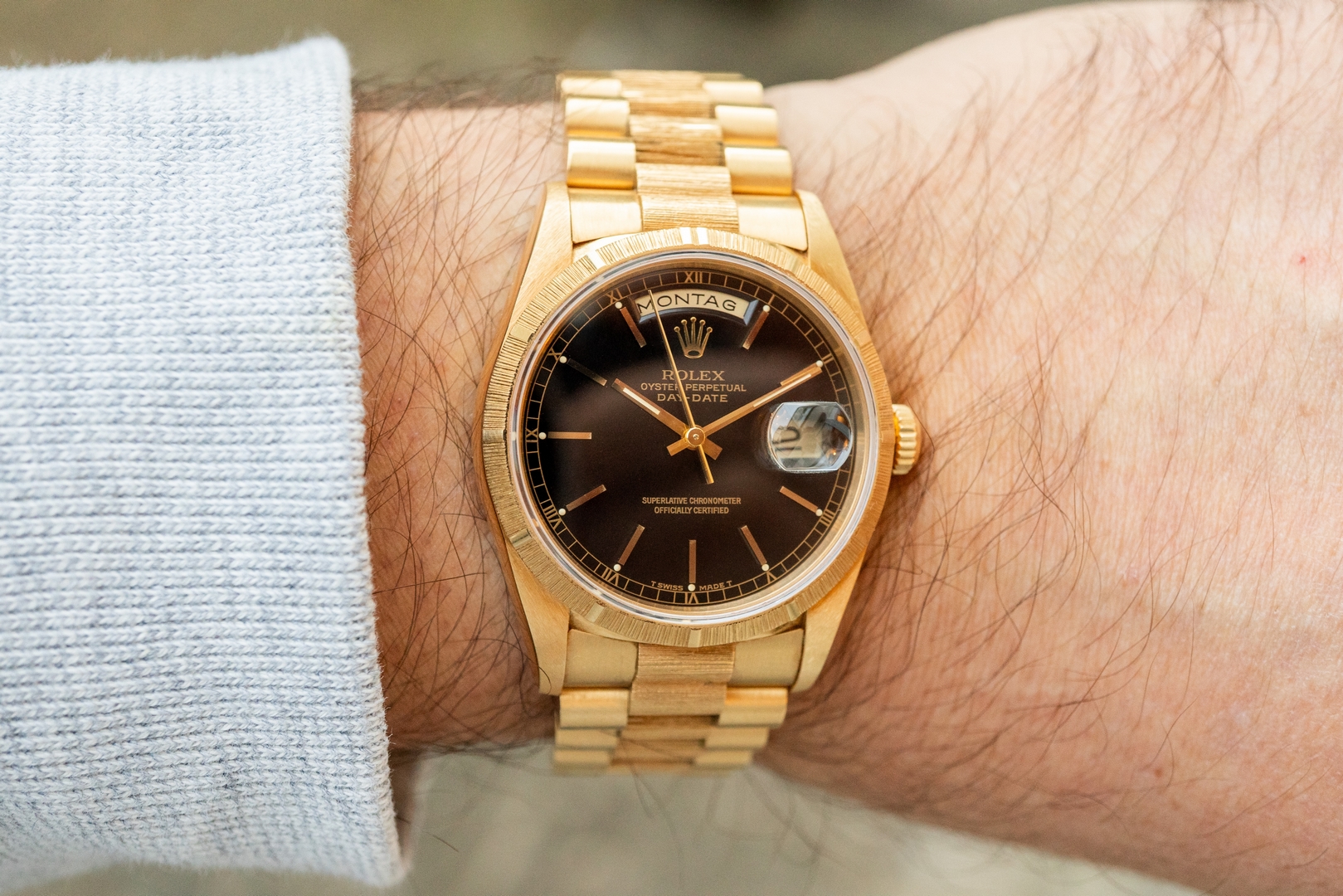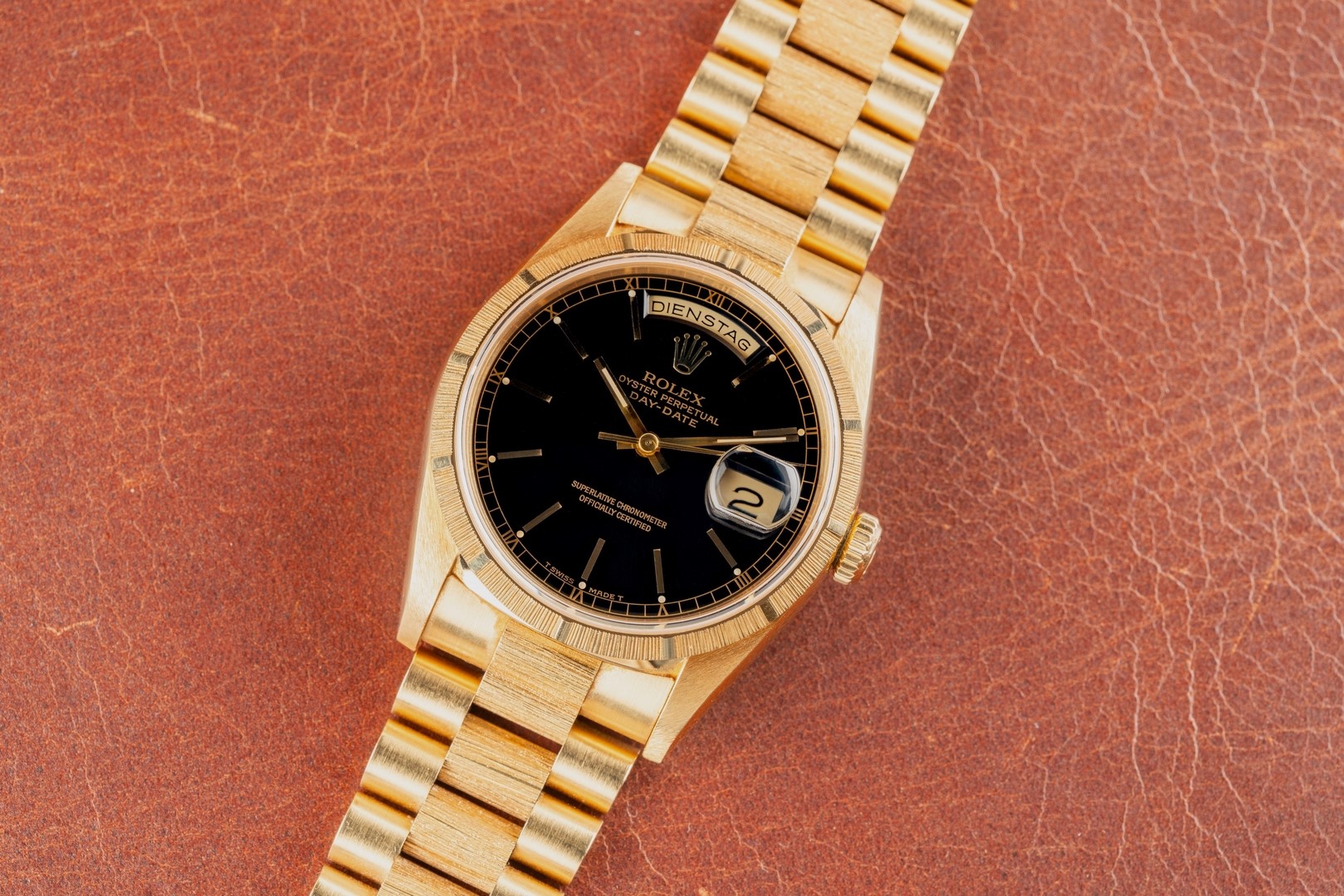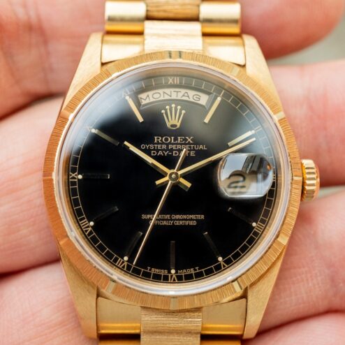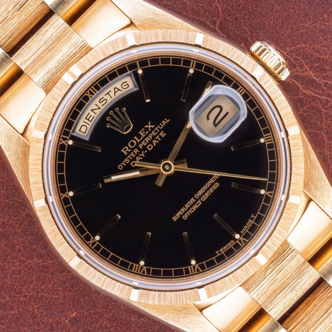 Das 8723 Präsident-Armband ist ebenso ein echtes Highlight. Perfekter Zustand ohne jeden Stretch und tolle Länge mit 23 Gliedern. Der Schließencode lautet S1 und da die Uhr direkt vom Erstbesitzer stammt erkennt man wieder, dass die Schließcodes bei Day-Dates so eine Sache sind. S1 steht eigentlich für Januar 1994, aber die Uhr wurde exakt mit diesem Band ausgeliefert. Rolex hat Goldbänder auf Lager produziert und dies in Chargen. Hier wurde eine frische Vorproduktion verwandt, wahrscheinlich weil man einfach keine anderen Borke Präsident Bänder auf Lager hatte.