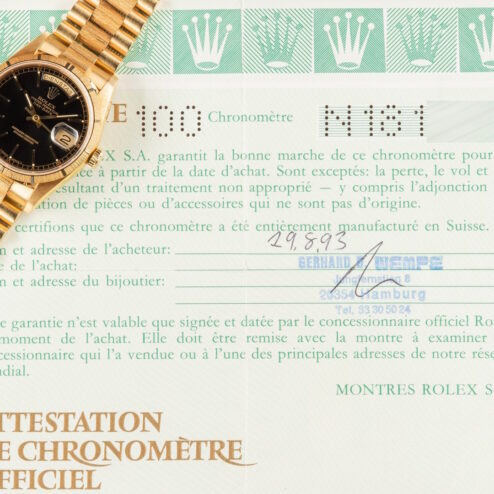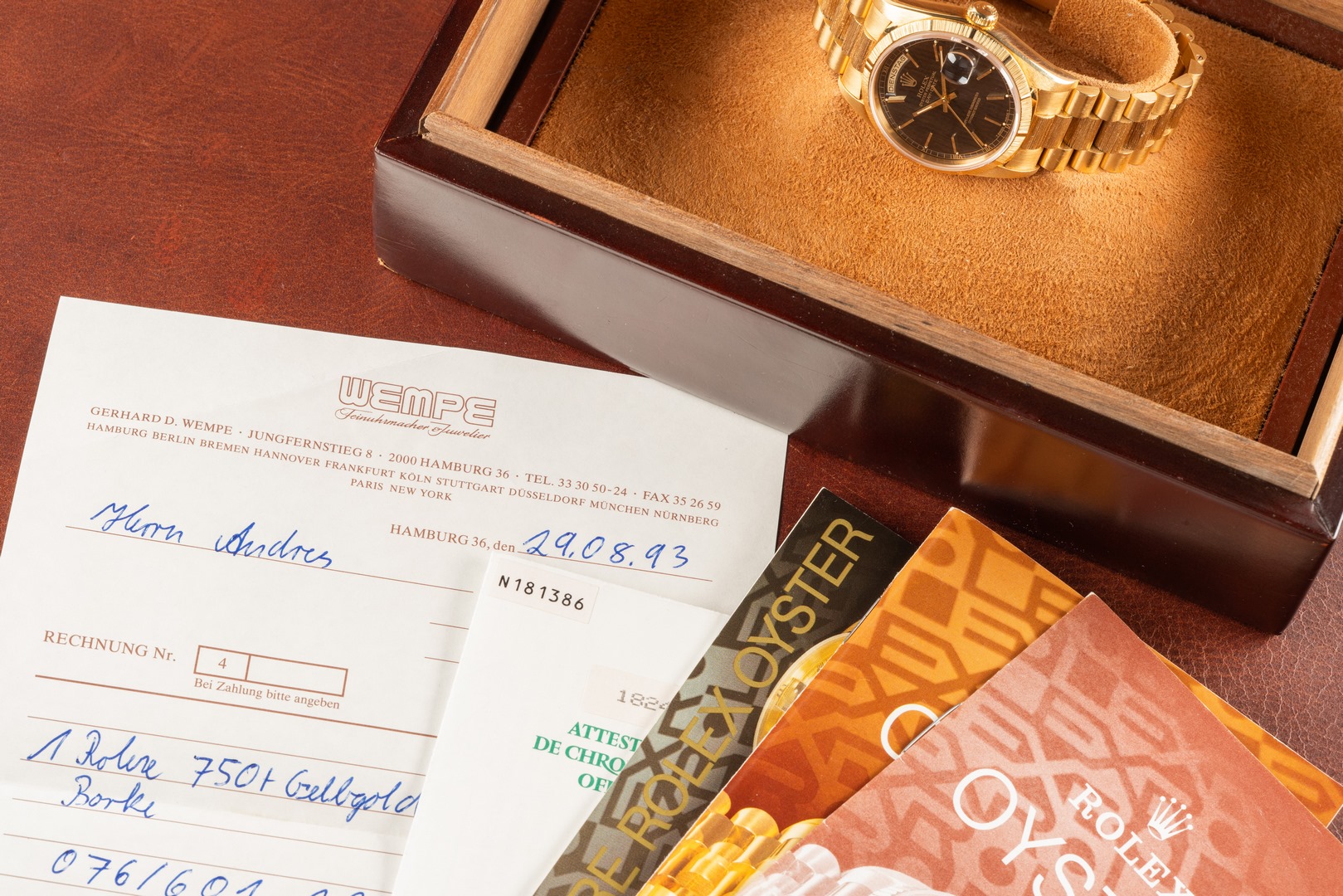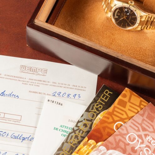 Diese wundervolle Day-Date kommt im perfekten full Set. Sie stammt aus Deutschland und wurde 29.08.1993 von Wempe in Hamburg verkauft. Das Set ist wirklich mega, inkl. ERSTKAUFRECHNUNG, Booklet und einem tollen Rolex Katalog.