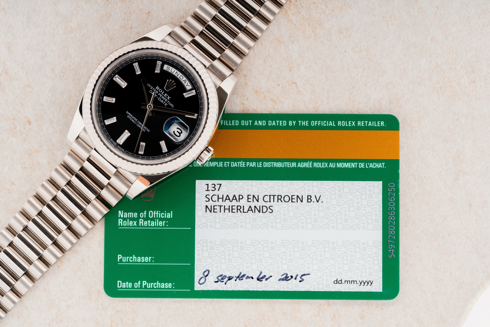 Diese tolle Day-Date erfreut ihren neuen Besitzer mit Box und Papieren aus den Niederlanden. Sie wurde am 08.09.2015 von Schaap en Citroen in den Niederlanden (LC 137) verkauft.