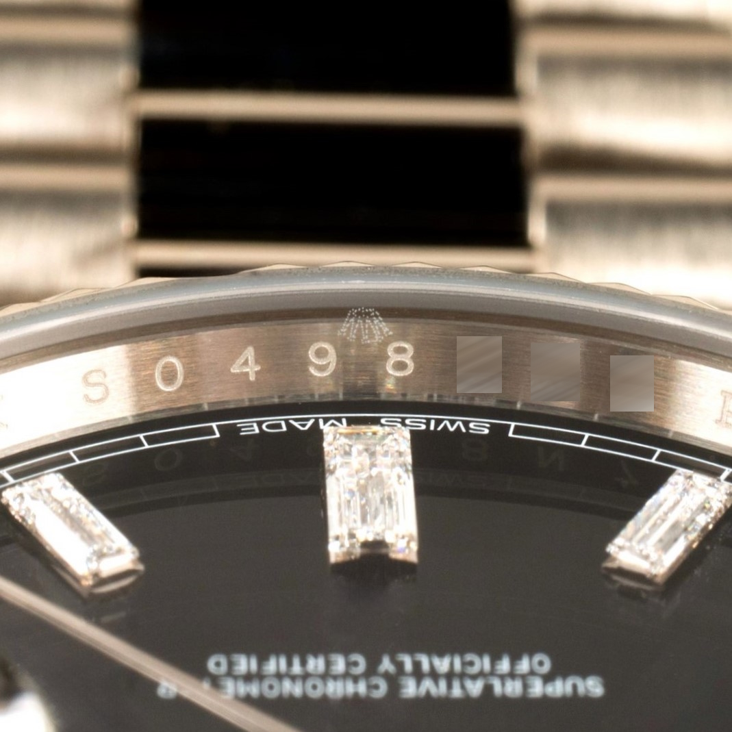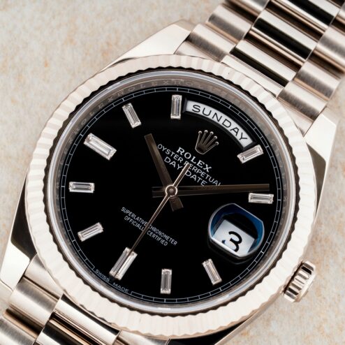 Das schwarze Day-Date Zifferblatt ist natürlich perfekt. Es handelt sich um die seltene und bildschöne Variante mit Baguette Diamant Indexen.
