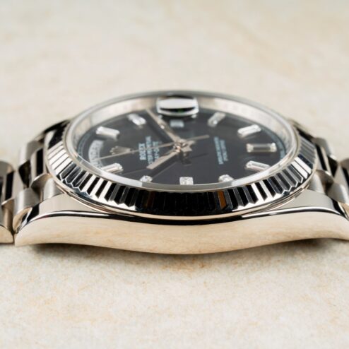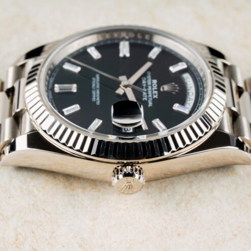 Beschreibung: Weißgold Day-Date im wunderbaren Zustand mit seltenem schwarzen Baguette-Diamant Zifferblatt.