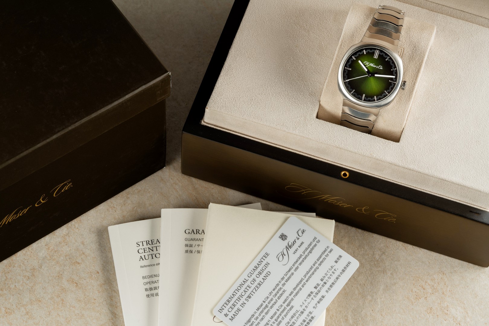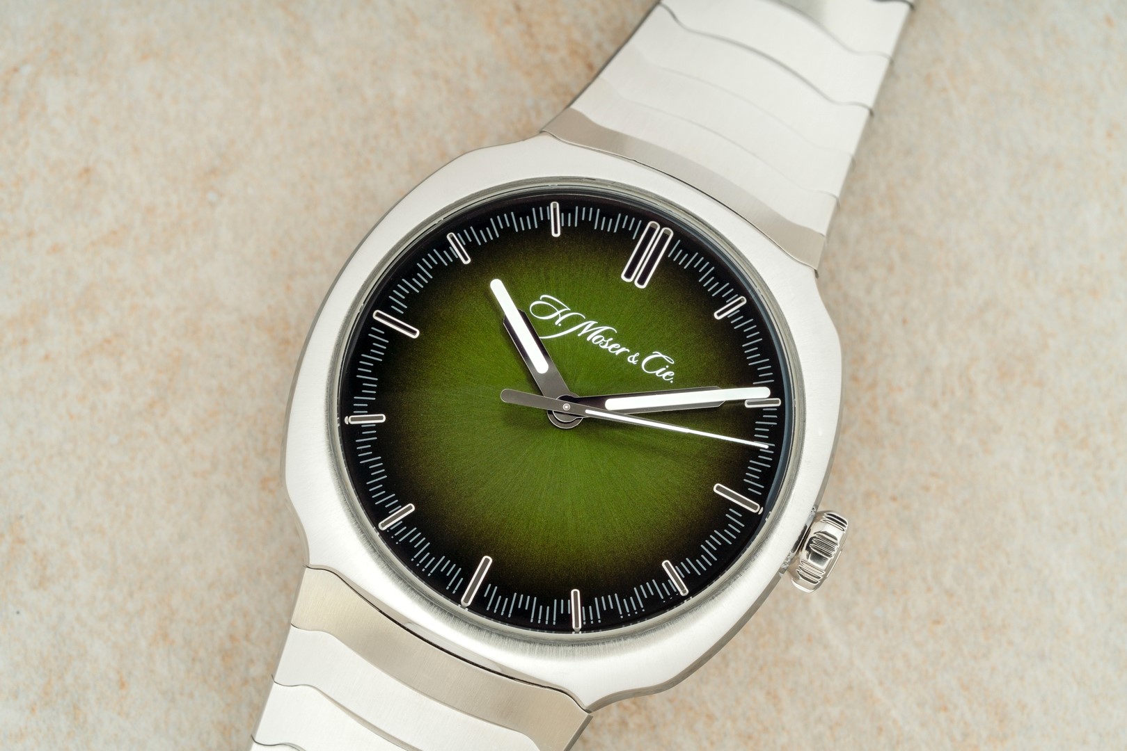 Beschreibung: Moser Centre Seconds mit dem mega Matrix Green Fumé Blatt.