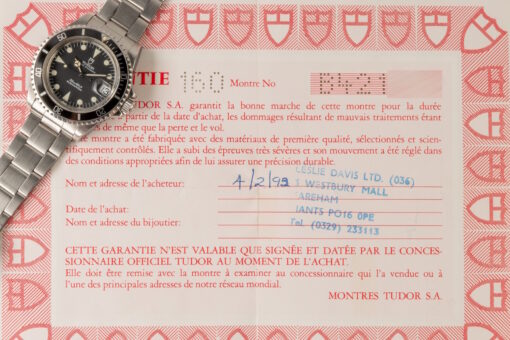Diese feine schwarze Tudor SUB erfreut ihren neuen Besitzer als wirklich tolles full set. Die Uhr wurde am 04.02.1993 von LESLIE DAVIS LTD. in Großbritannien (LC 160) verkauft. Das Set ist wirklich cool mit Booklet, Anker, Hangtag usw.